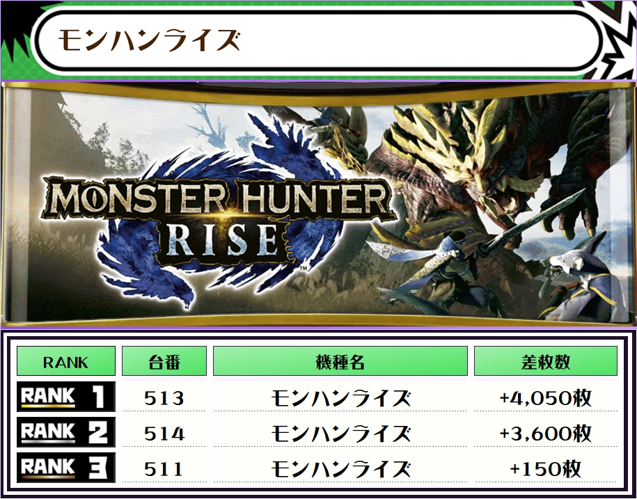 今回ピックアップした機種の中で私が気になったのはL東京喰種・モンハンライズの2機種だな🔥 どちらの機種も客付きも稼働も抜群だったぞ!!