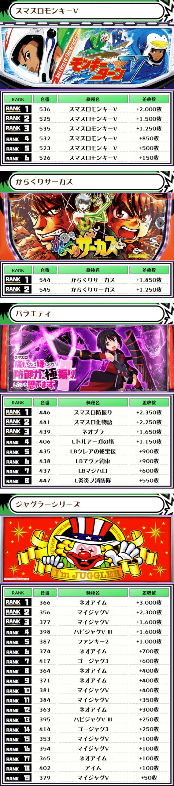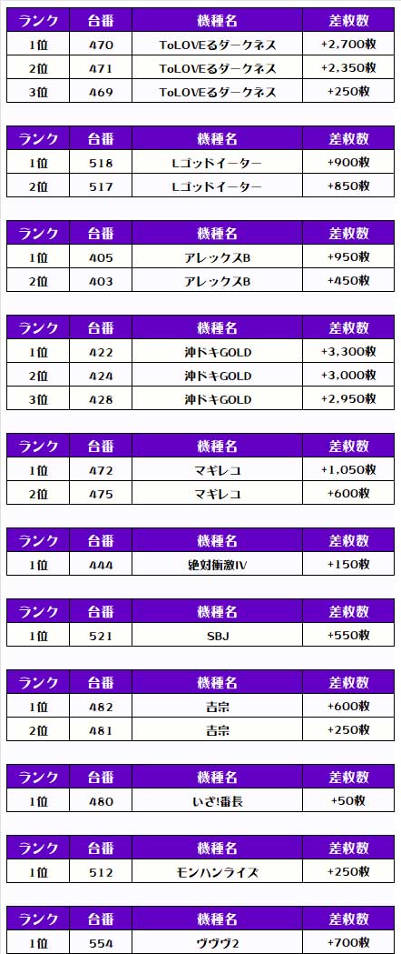 ということで、この日の店舗全体差枚数ランキングがこちら!!