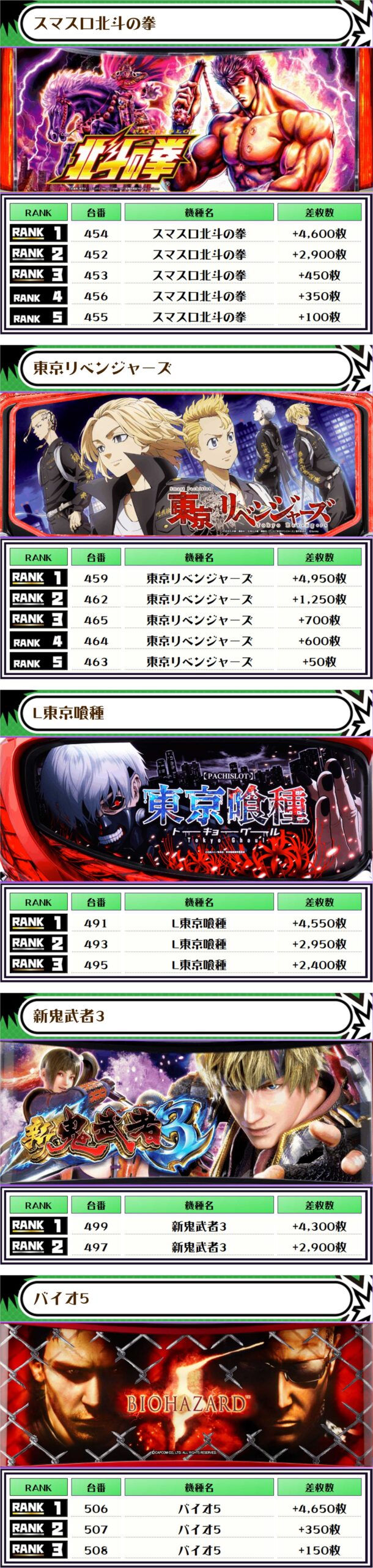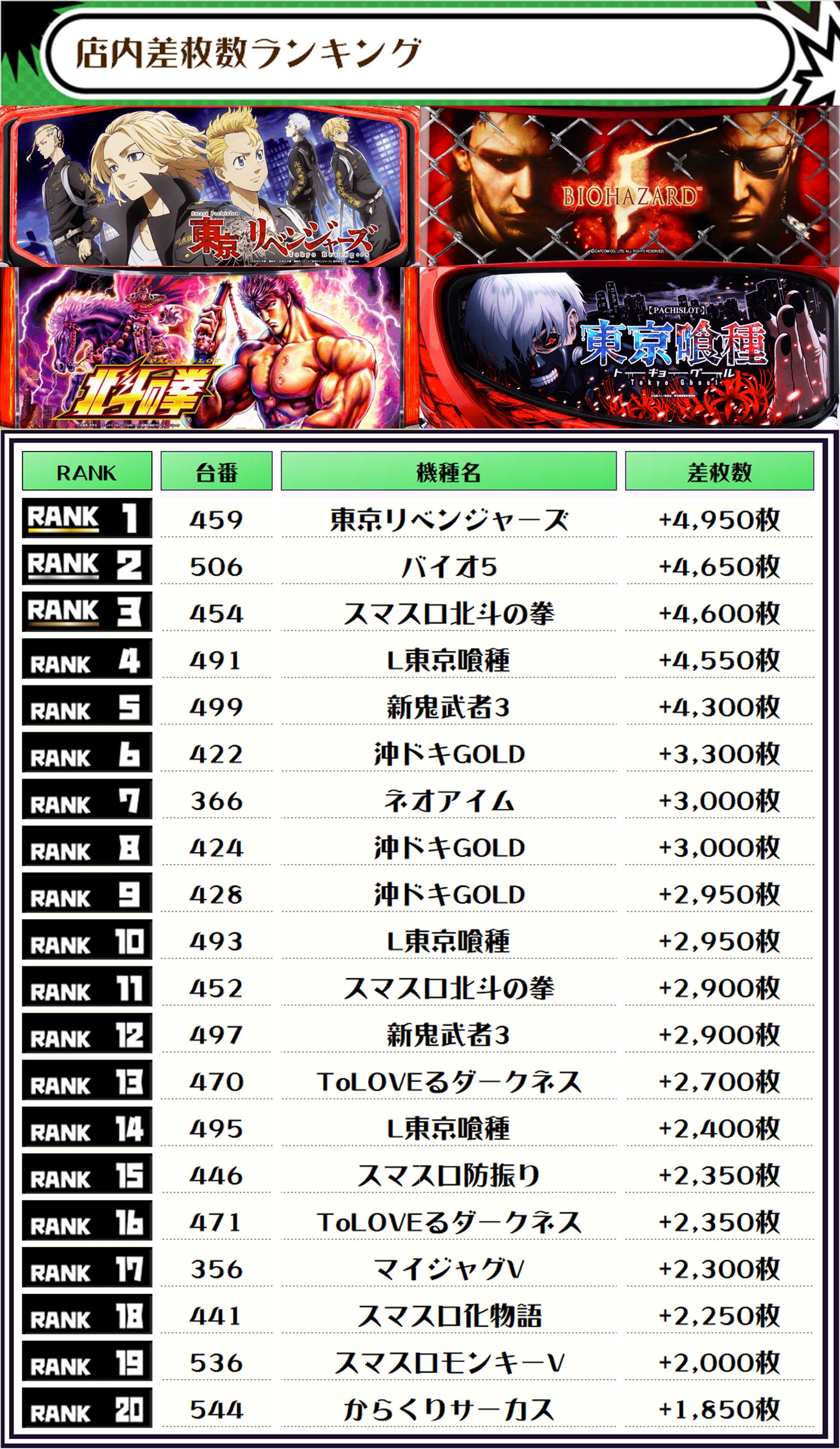 全体差枚のトップは【東京リベンジャーズ・459番台】で+4,950枚っ👍