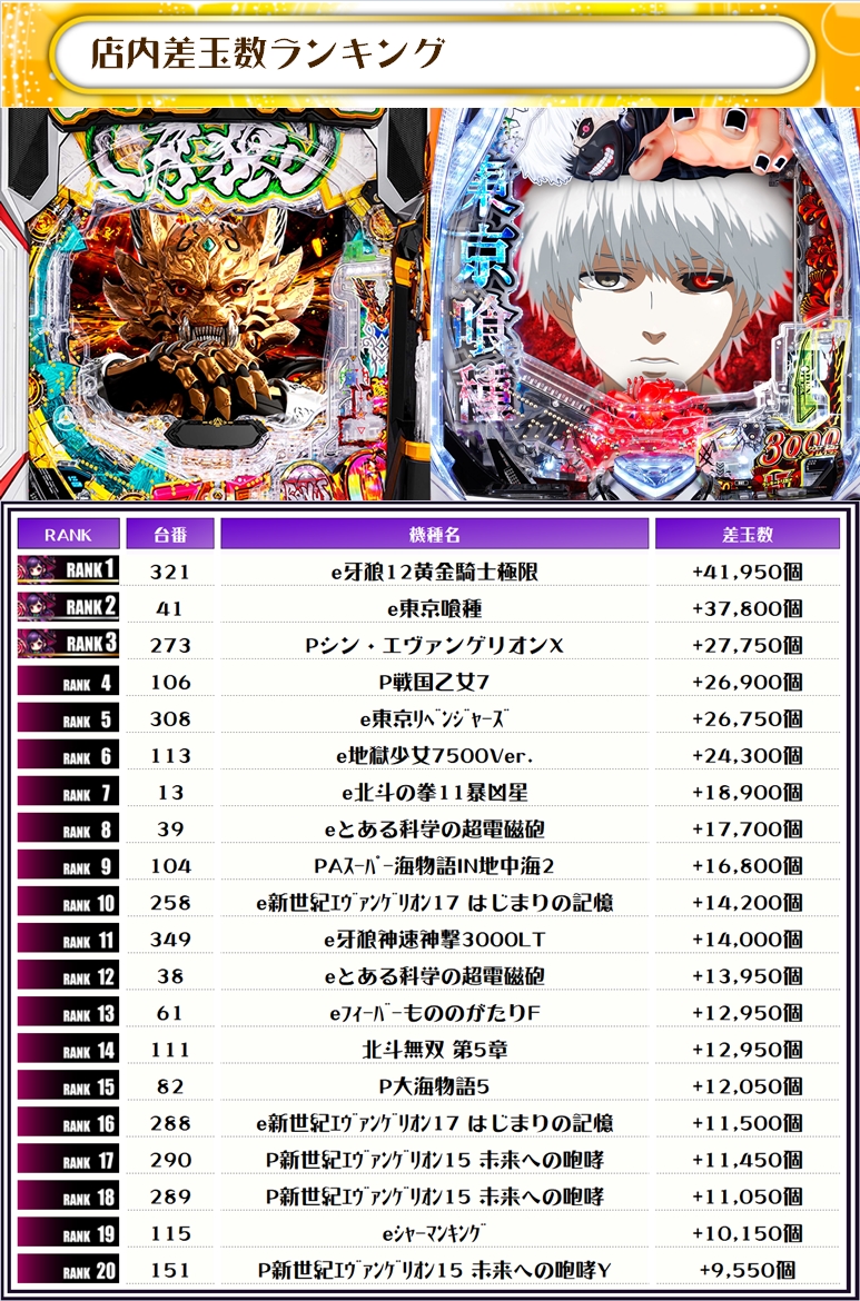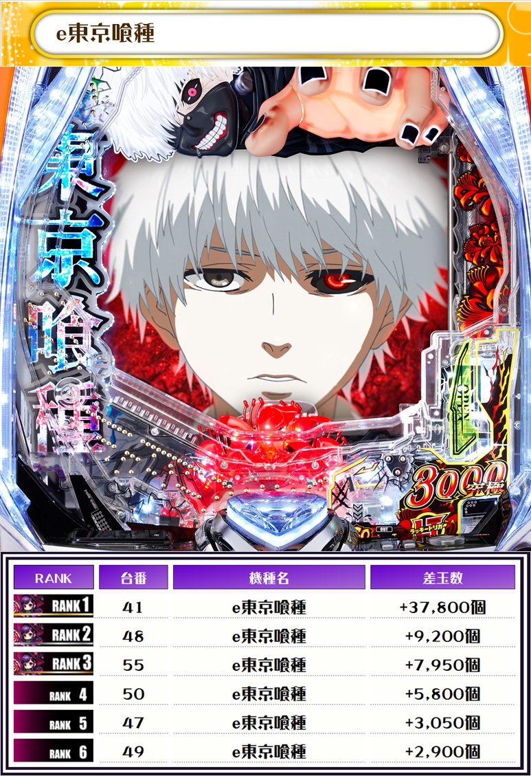 続く2位にも【e東京喰種・41番台】の+37,800発、そして3位には【Pシン・エヴァンゲリオンX・273番台】の+27,750発がランクインしました~✨