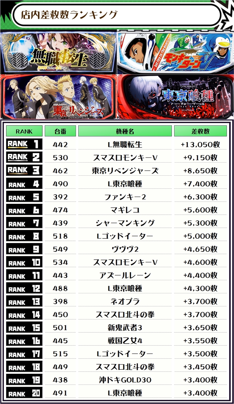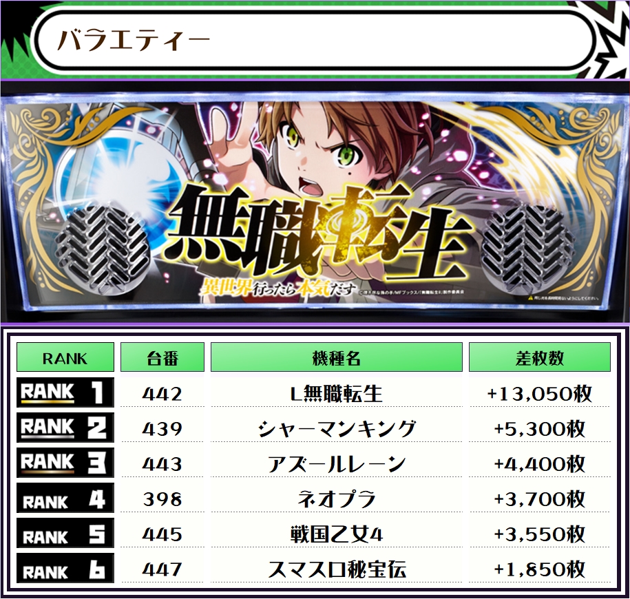 全体差枚のトップは【L無職転生・442番台】で+13,050枚っ👍