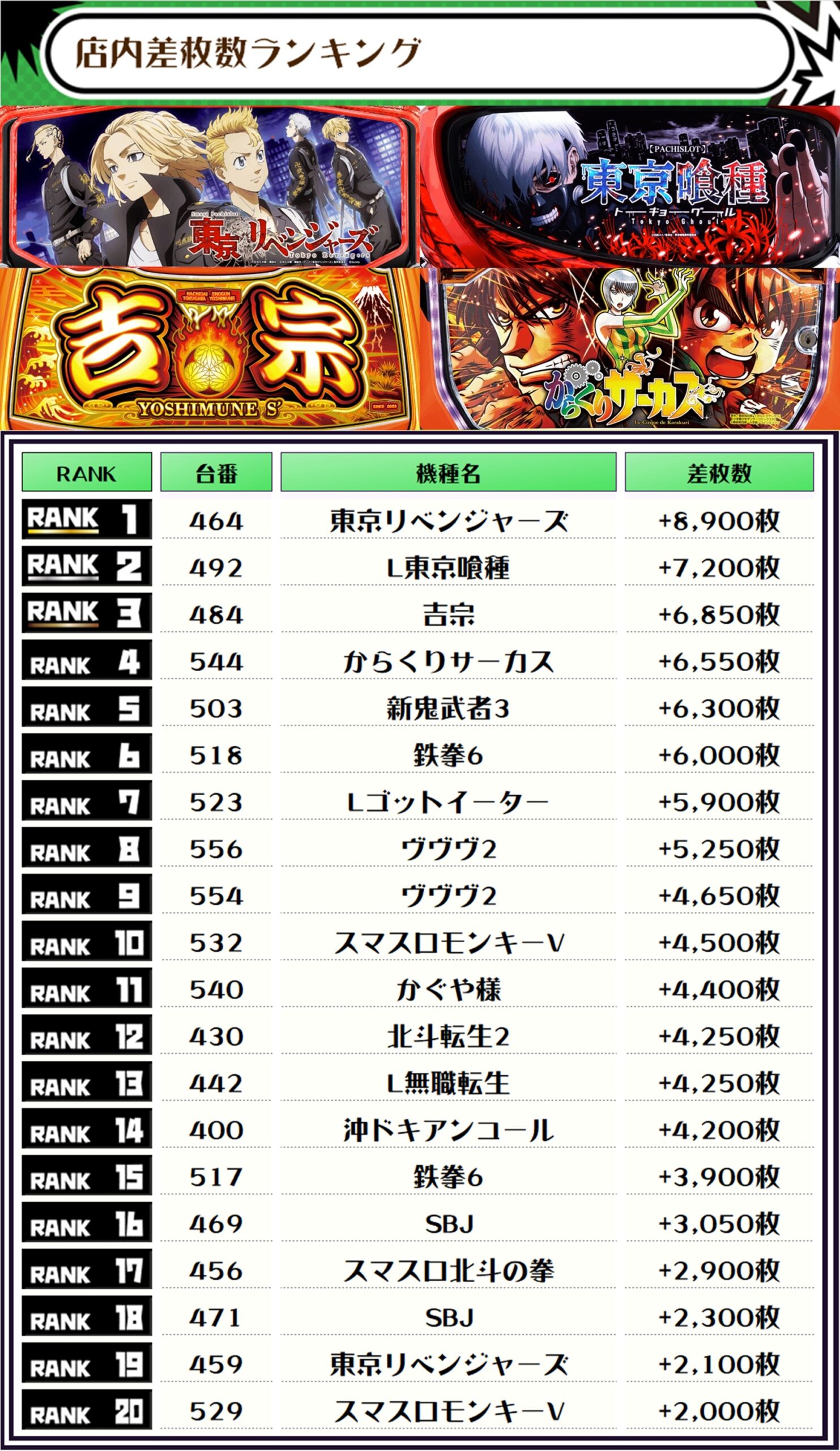 全体差枚のトップは【東京リベンジャーズ・464番台】で+8,900枚っ👍