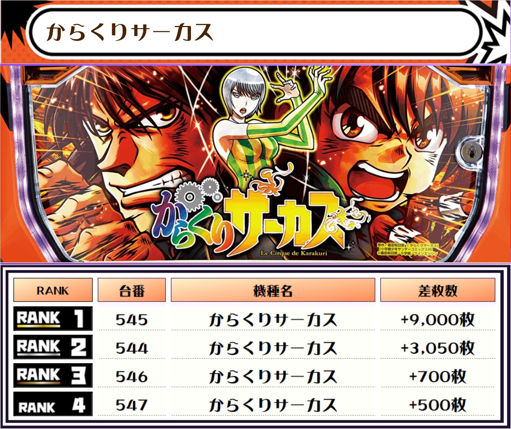2位には【かぐや様・541番台】の+9,350枚、そして3位には【からくりサーカス・545番台】の+9,000枚がランクインですっ✨