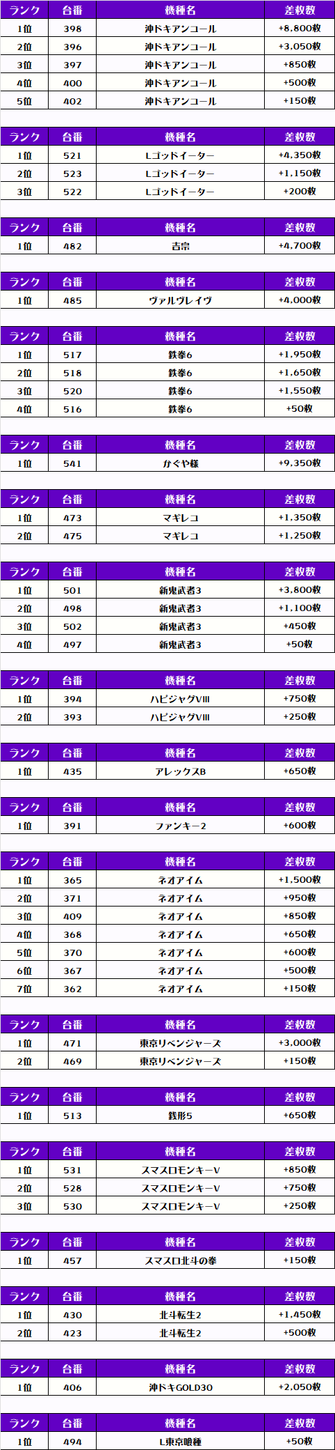 ということで、この日の店舗全体差枚数ランキングがコチラ🌟