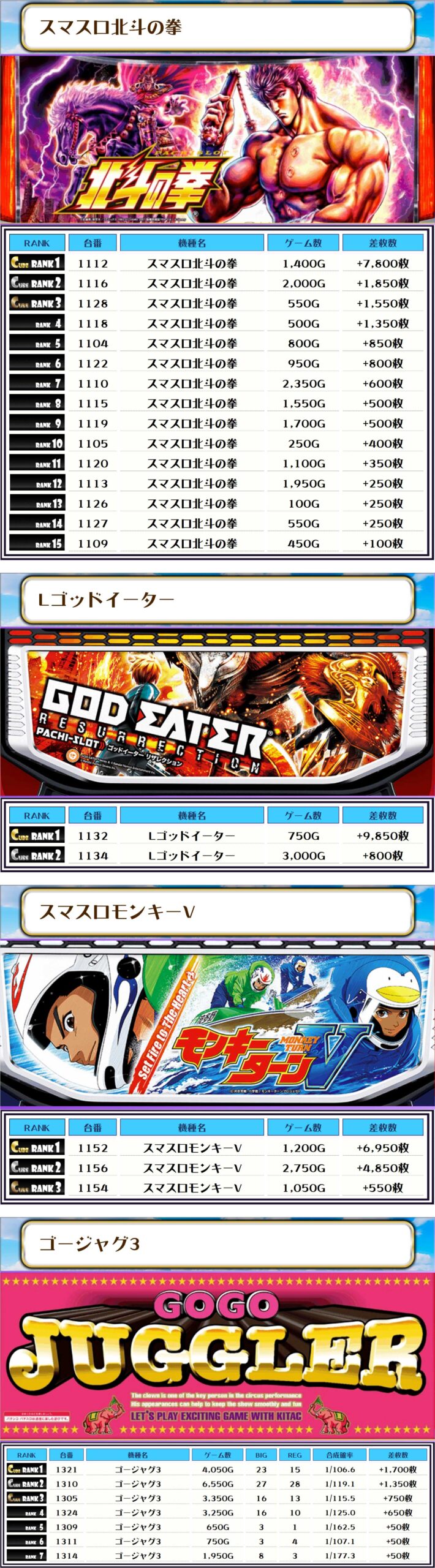 今回あっしが気になったのは、スマスロ北斗の拳・Lゴッドイーター・スマスロモンキーⅤ・ゴージャグ3の4機種でやんす📷