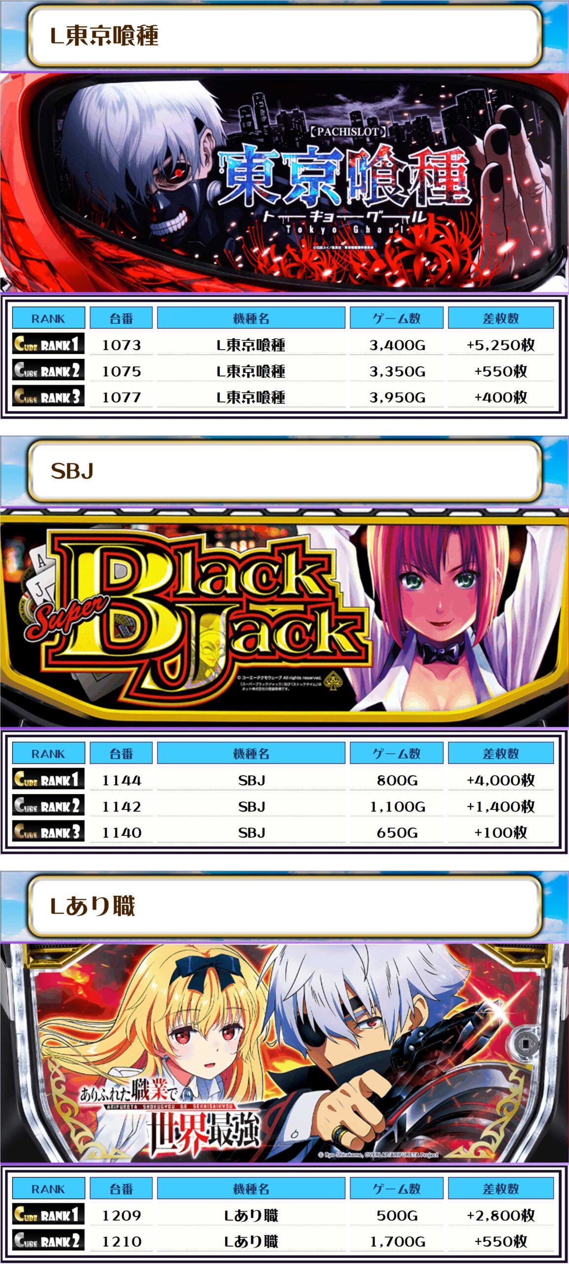 私が目を付けたのは、L東京喰種・SBJ・Lあり職の3機種だな👀稼働も高く、優秀台が多かったような印象を受けたぞ👍