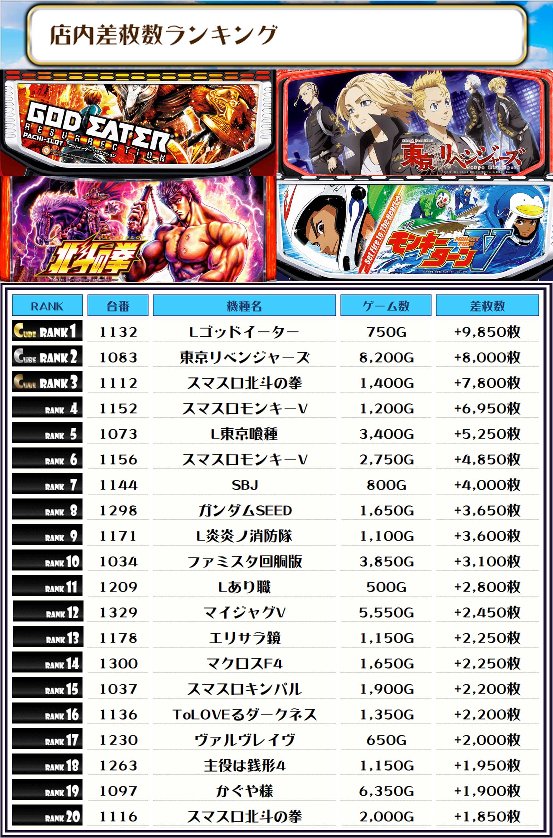 最後に、この日の店内差枚ランキングをご覧ください❗️