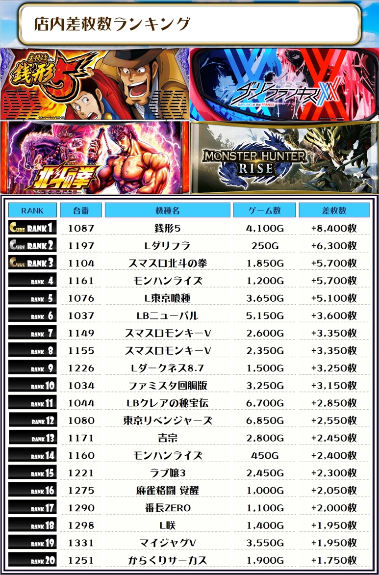 最後に、この日の店内差枚ランキングをご覧ください❗️
