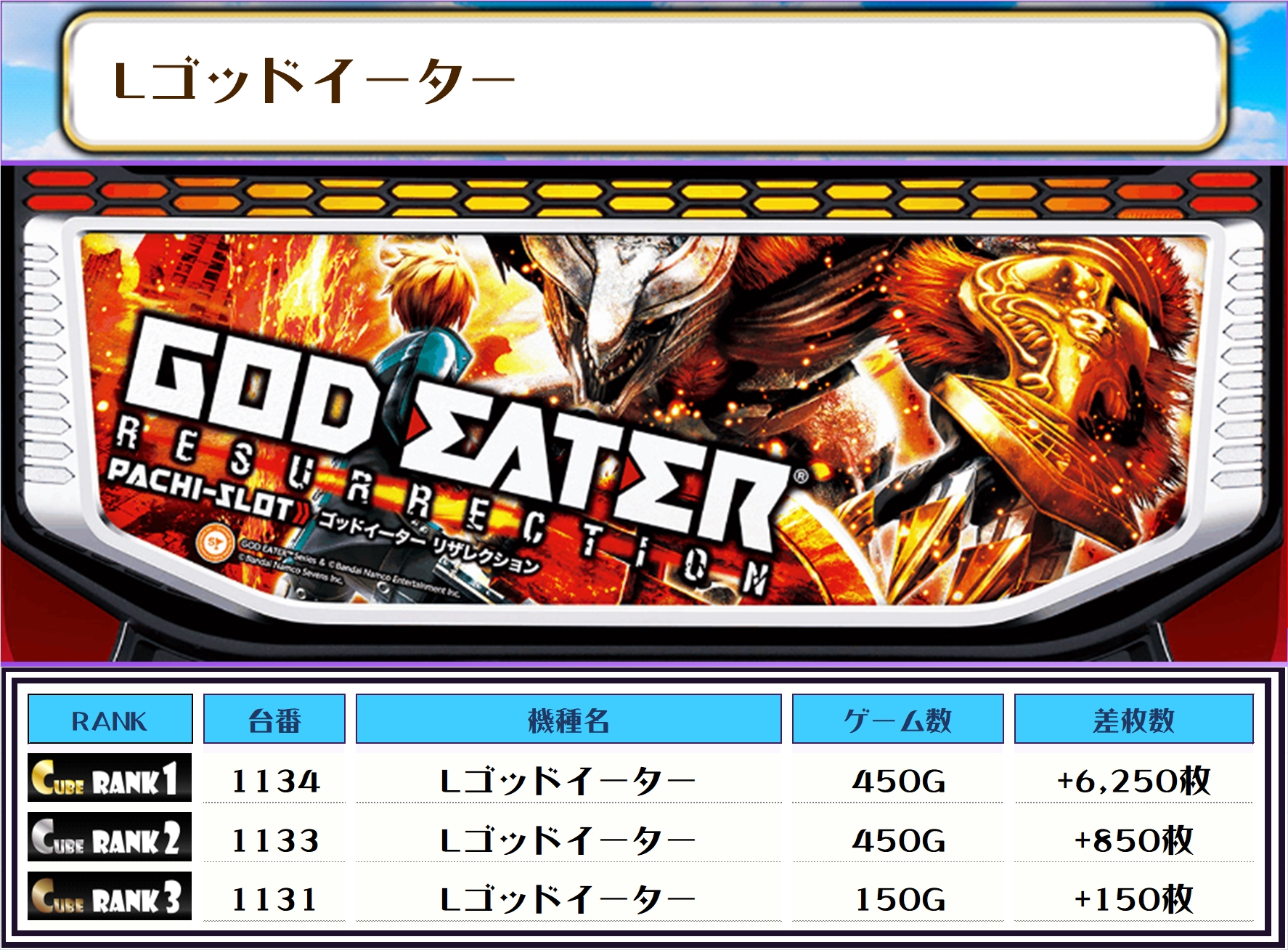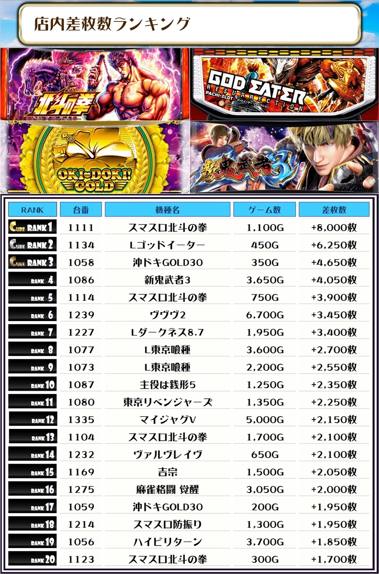 2位には【Lゴッドイーター・1134番台】の+6,250枚、そして3位には【沖ドキGOLD30・1058番台】の+4,650枚がランクインっ🏆🏆🏆