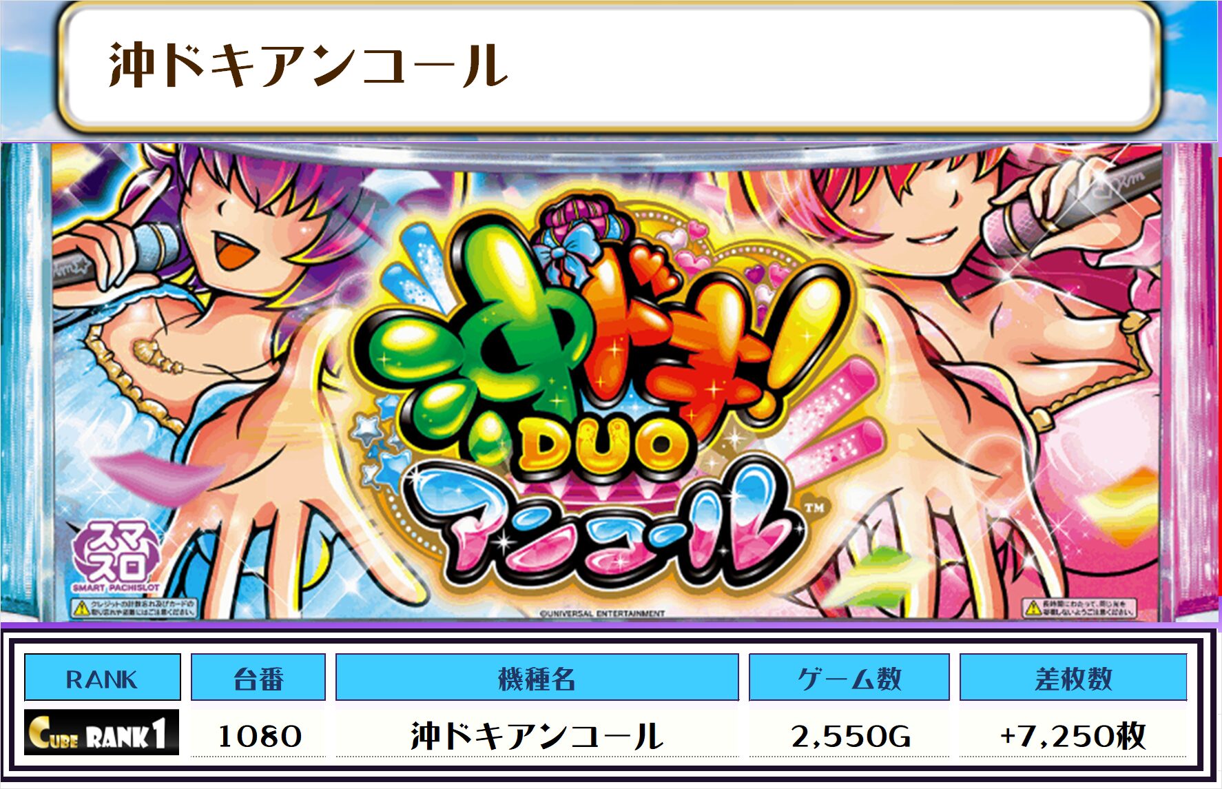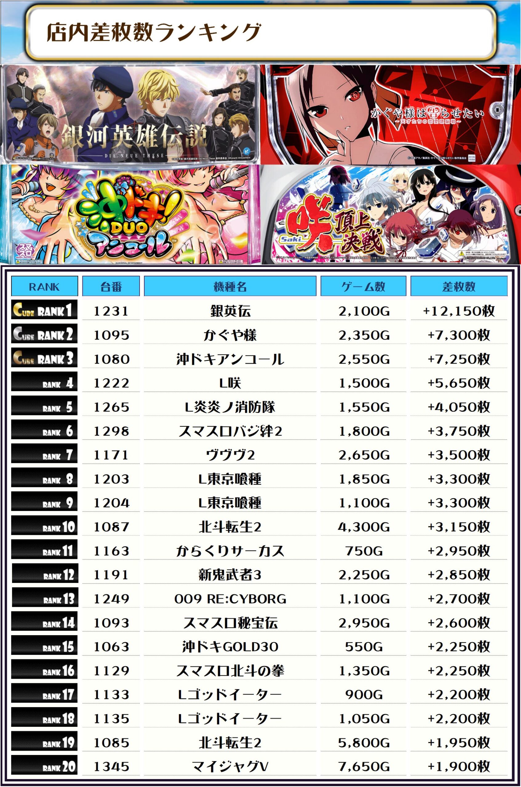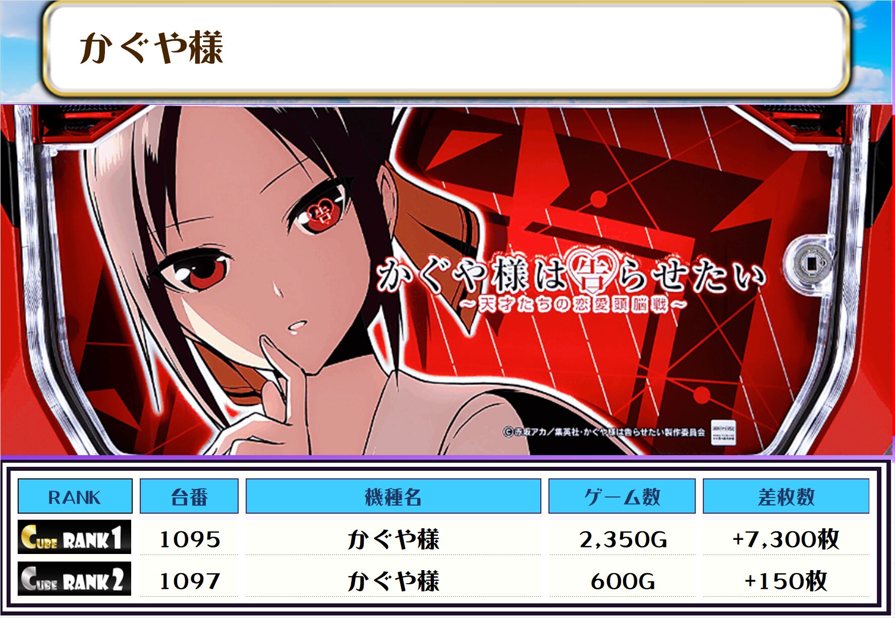 2位には【かぐや様・1095番台】の+7,300枚、そして3位には【沖ドキアンコール・1080番台】の+7,250枚がランクインっ🏆🏆🏆