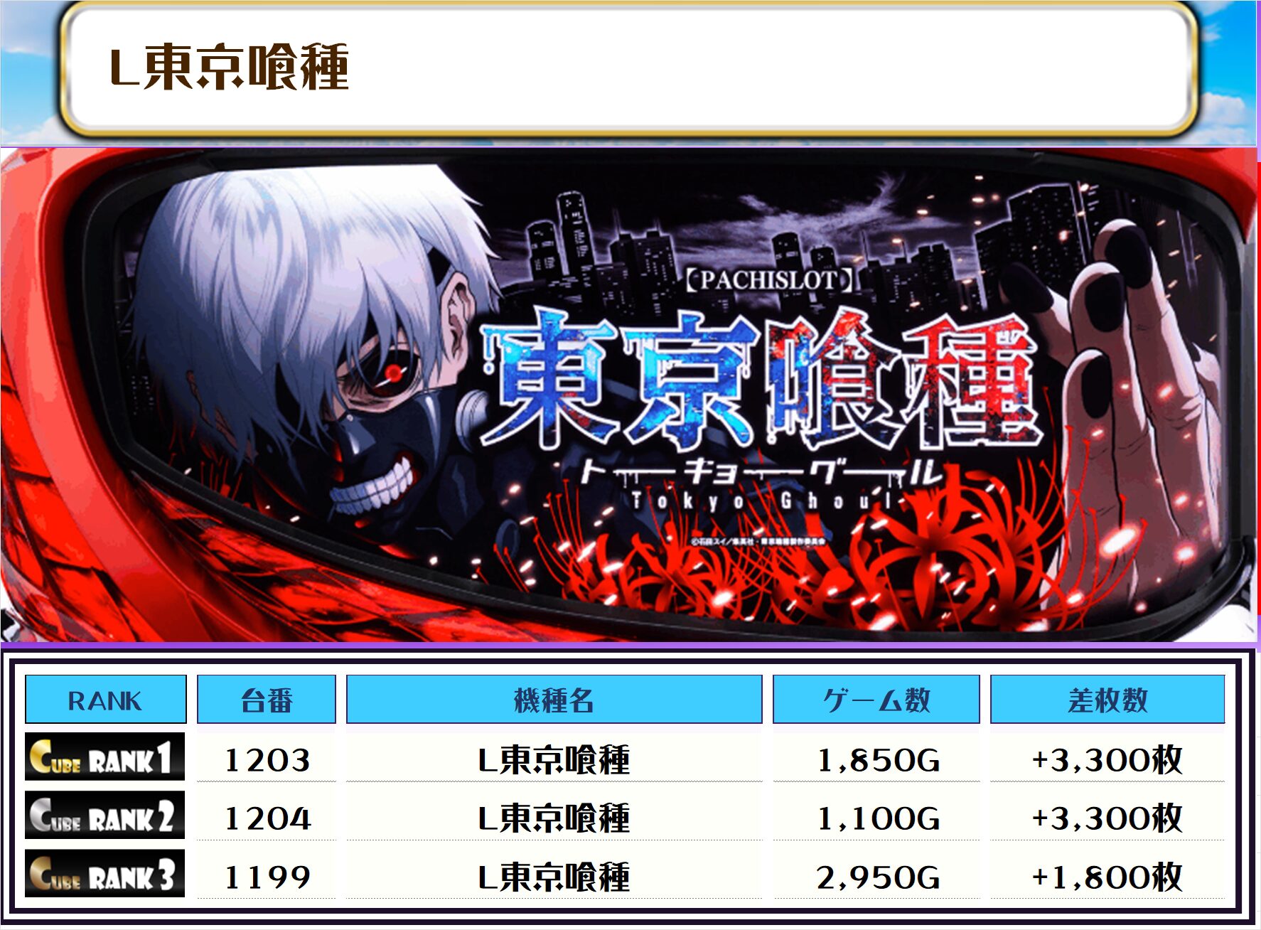 私が目を付けたのは北斗転生2とL東京喰種の2機種だな👀