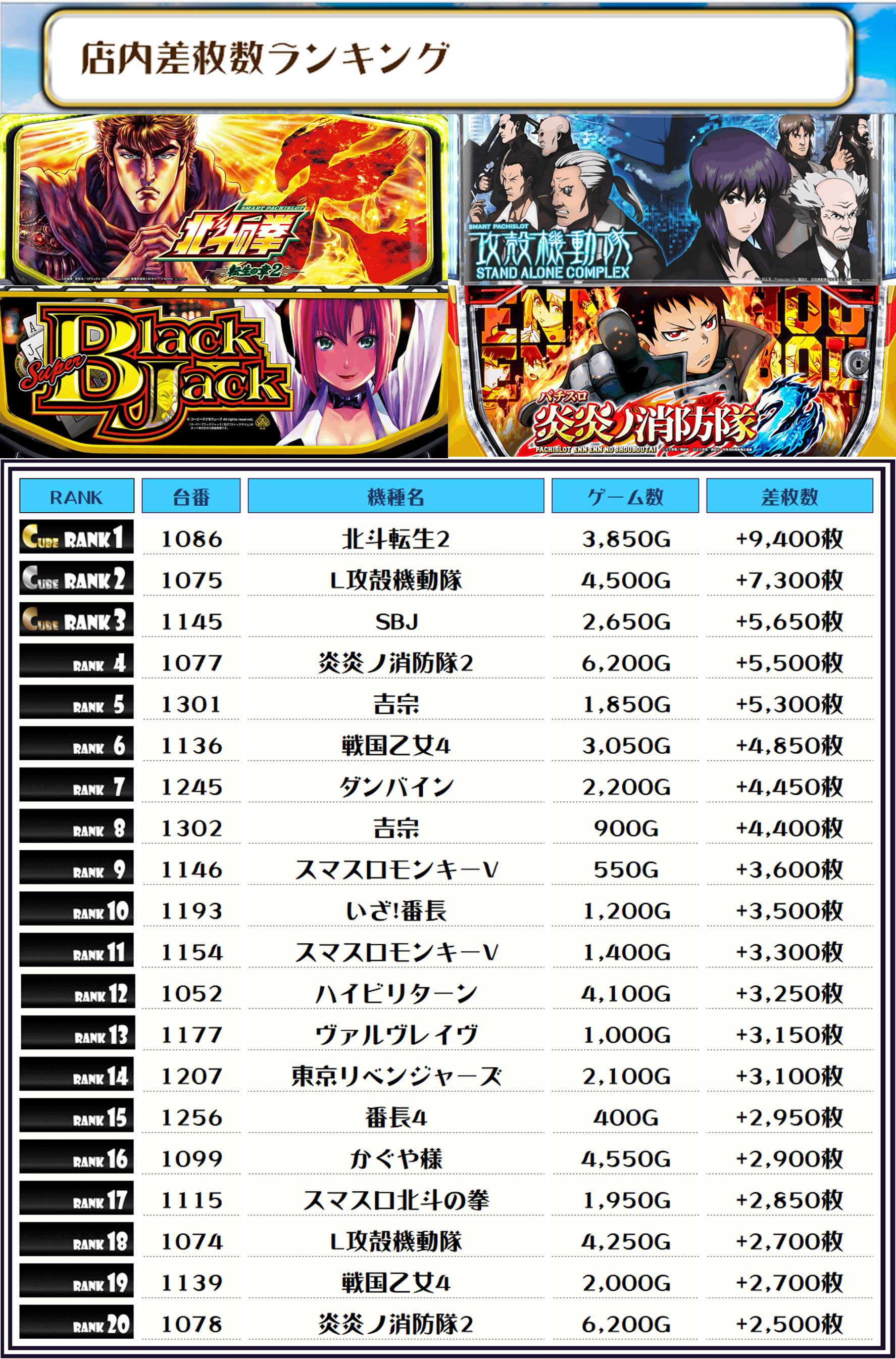 最後に、この日の店内差枚ランキングをご覧ください❗️