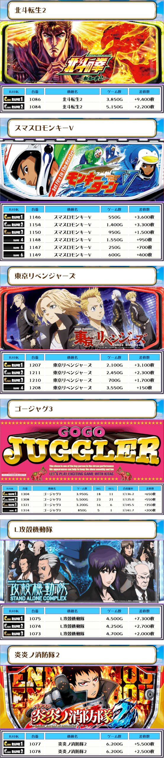 今回あっしが気になったのは北斗転生2・スマスロモンキーⅤ・東京リベンジャーズ・ゴージャグ3の4機種でやんす📷