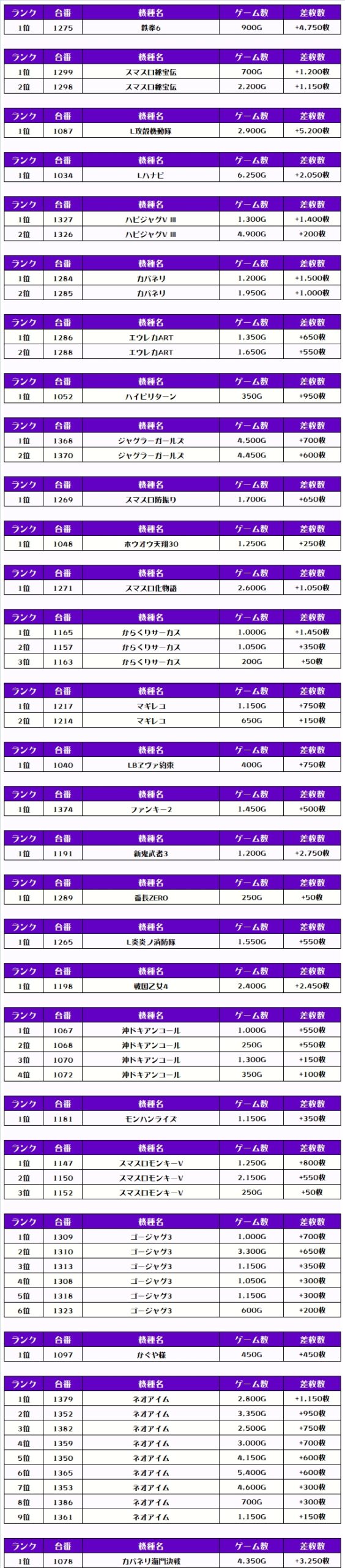 それでは早速、機種別差枚ランキングをチェックするでやんすっ❗️