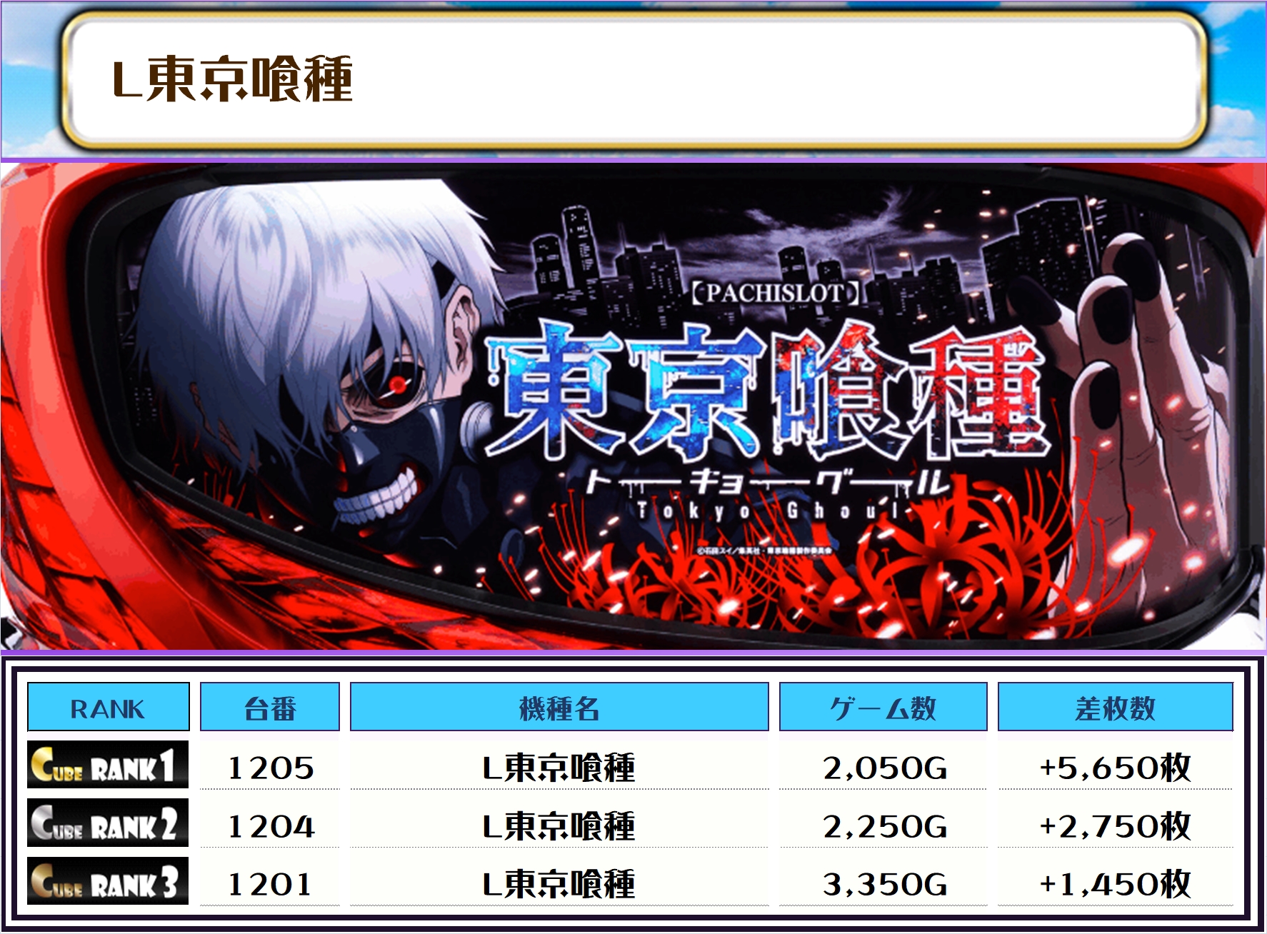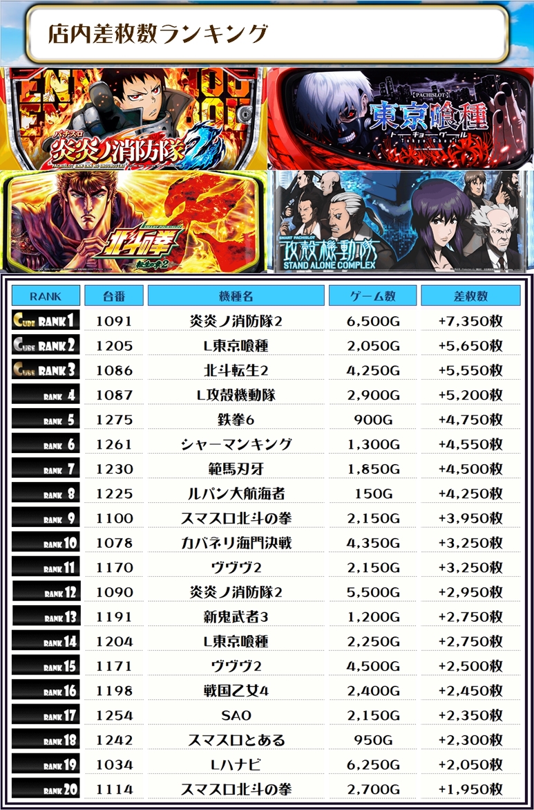 2位には【L東京喰種・1205番台】の+5,650枚、そして3位には【北斗転生2・1086番台】の+5,550枚がランクインっ🏆🏆🏆