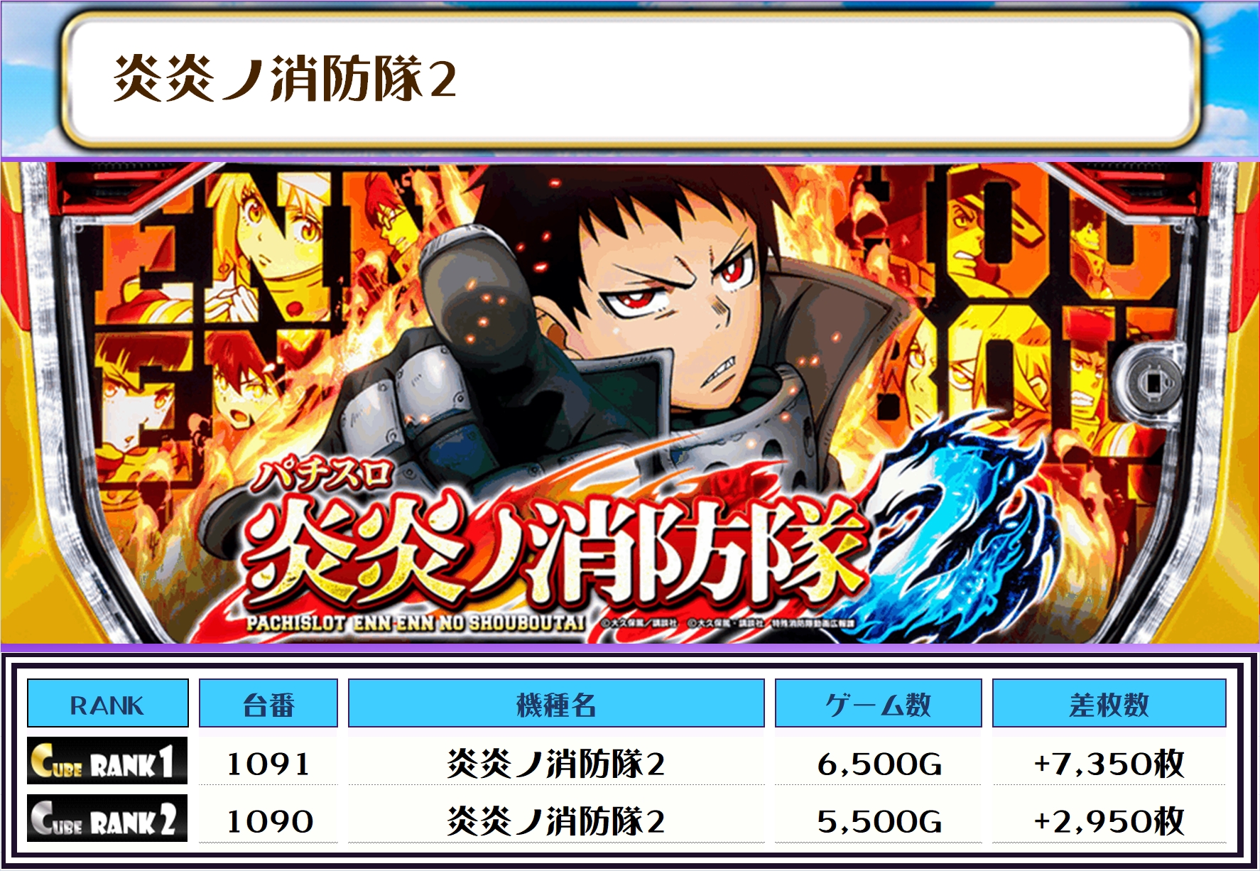この日、全体の差枚トップに輝いたのは【炎炎ノ消防隊2・1091番台】で+7,350枚‼️