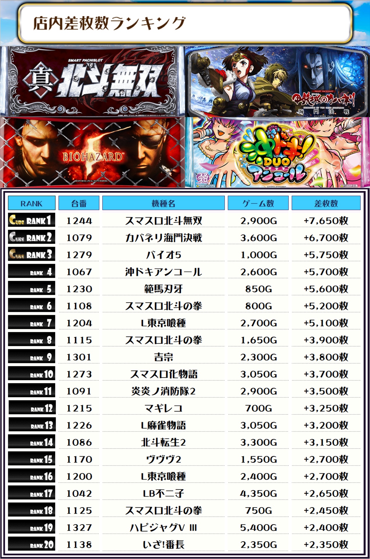 最後に、この日の店内差枚ランキングをご覧ください❗️