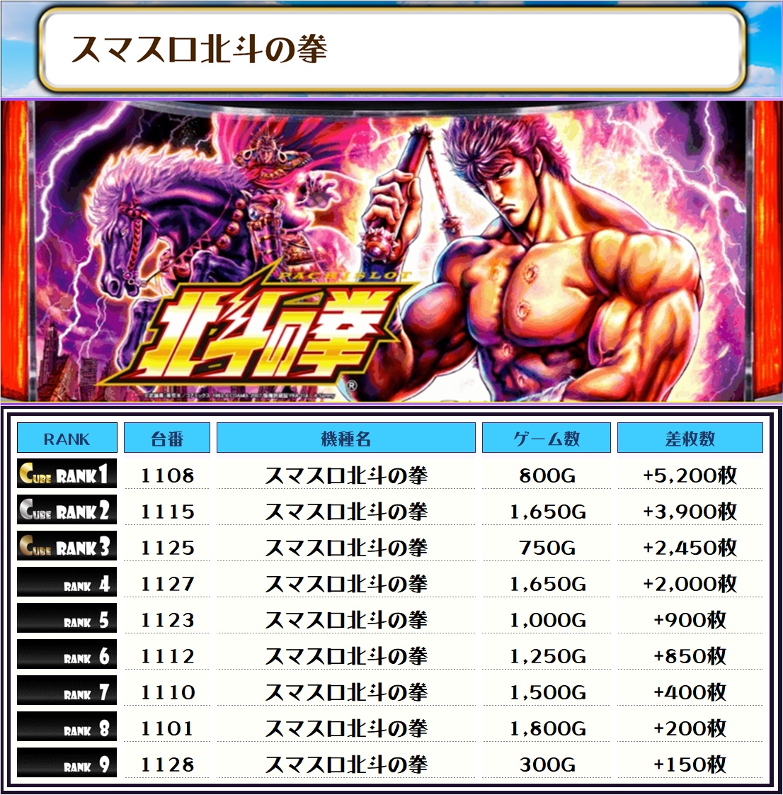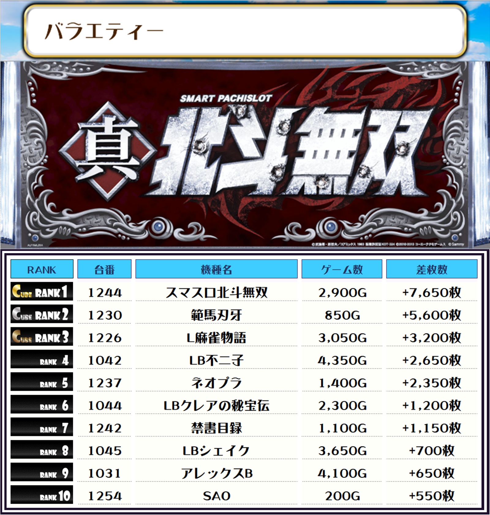 この日全体の差枚トップに輝いたのは【スマスロ北斗無双・1244番台】で+7,650枚‼️