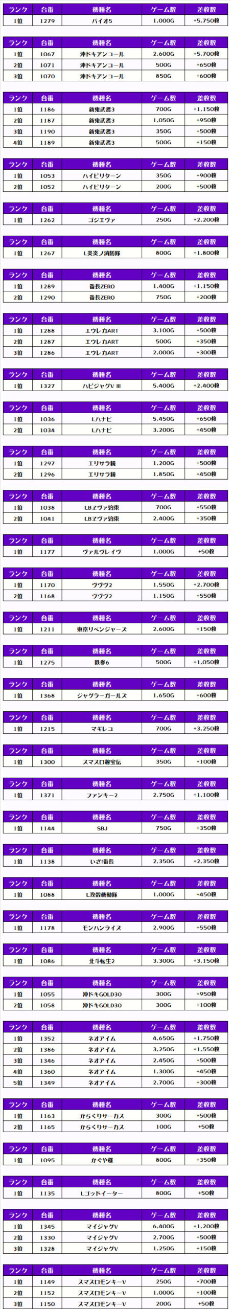 それでは早速、機種別差枚ランキングをチェックするでやんすっ❗️