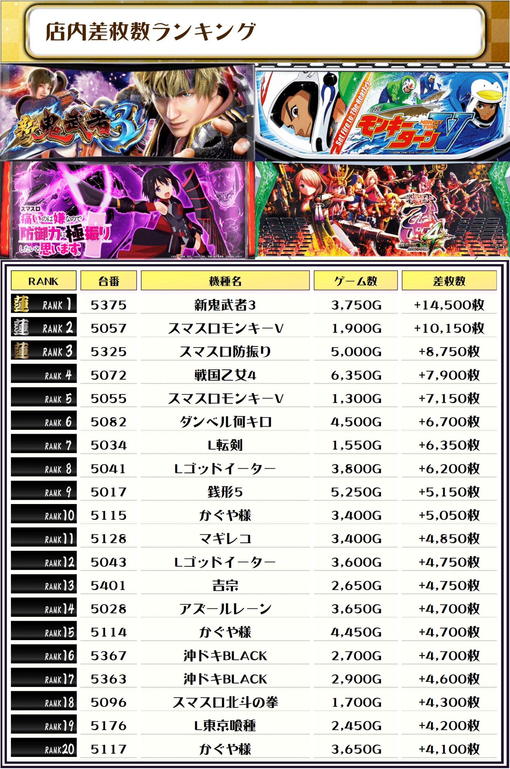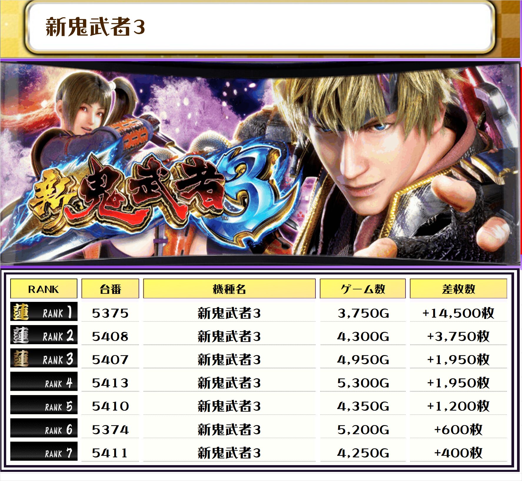 全体のTOPは【新鬼武者3・5375番台】で+14,500枚‼️