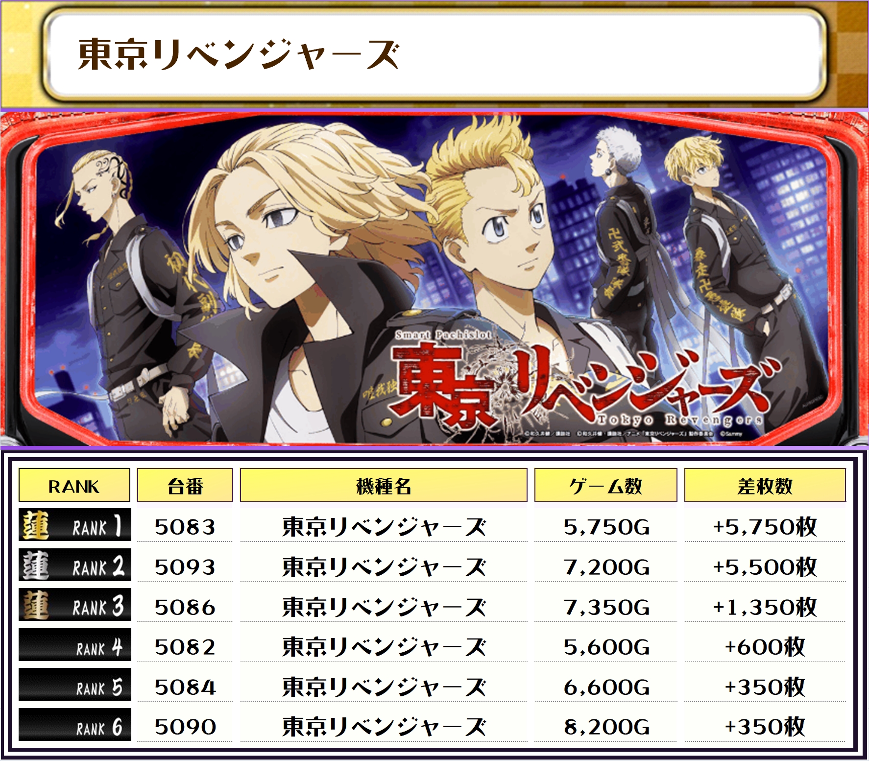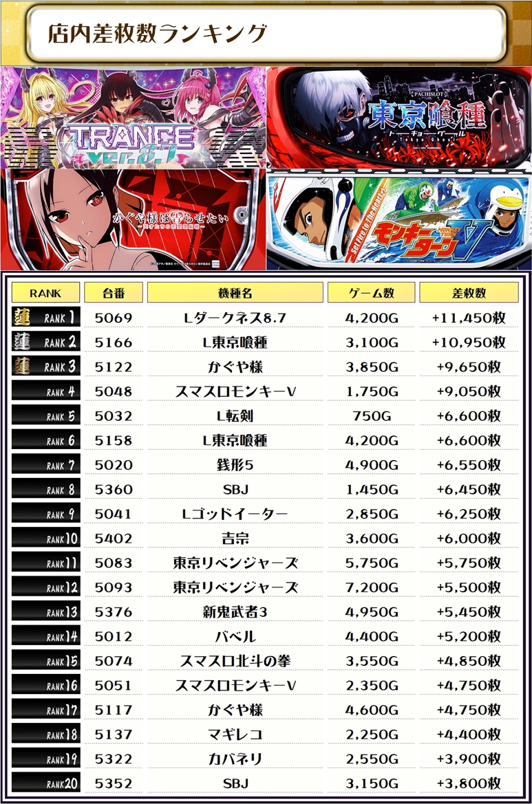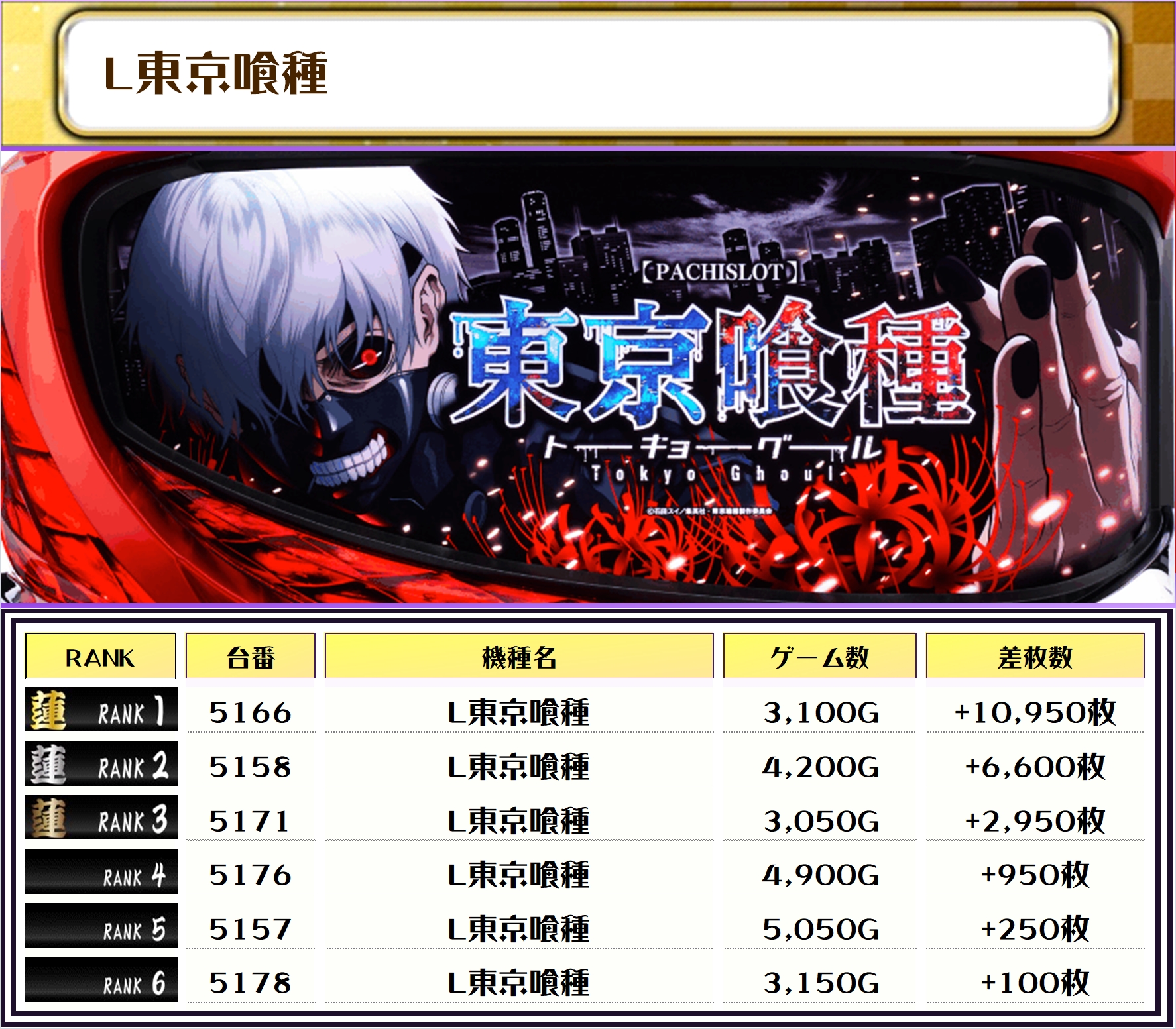 続く2位には【L東京喰種・5166番台】の+10,950枚、そして3位には【かぐや様・5122番台】の+9,650枚がランクインっ🏆🏆🏆