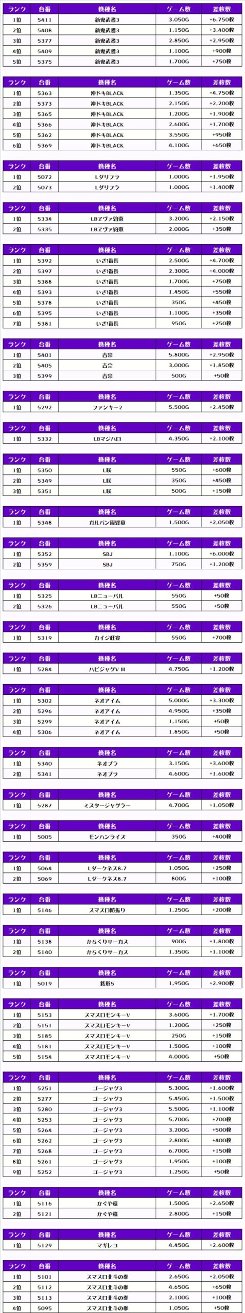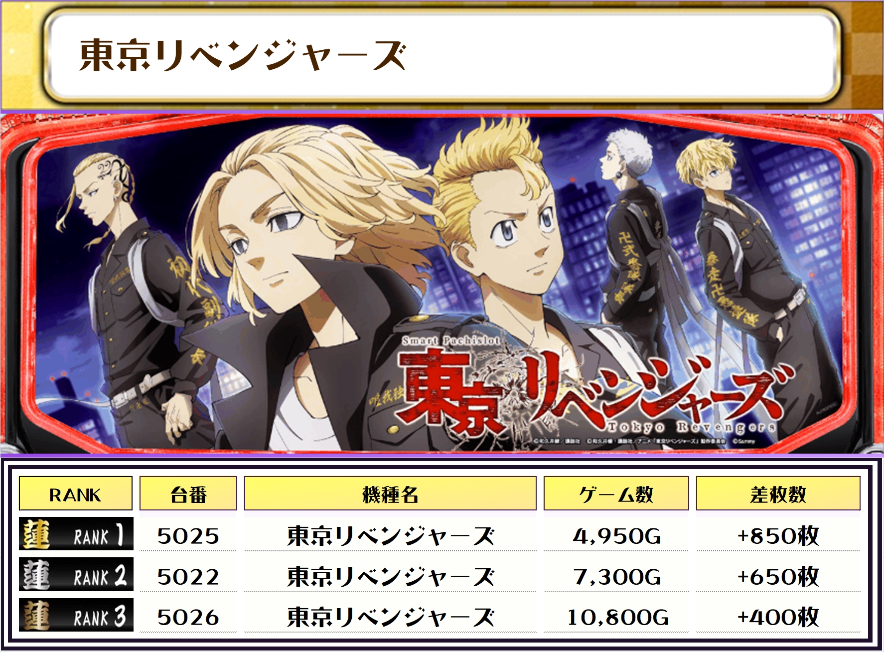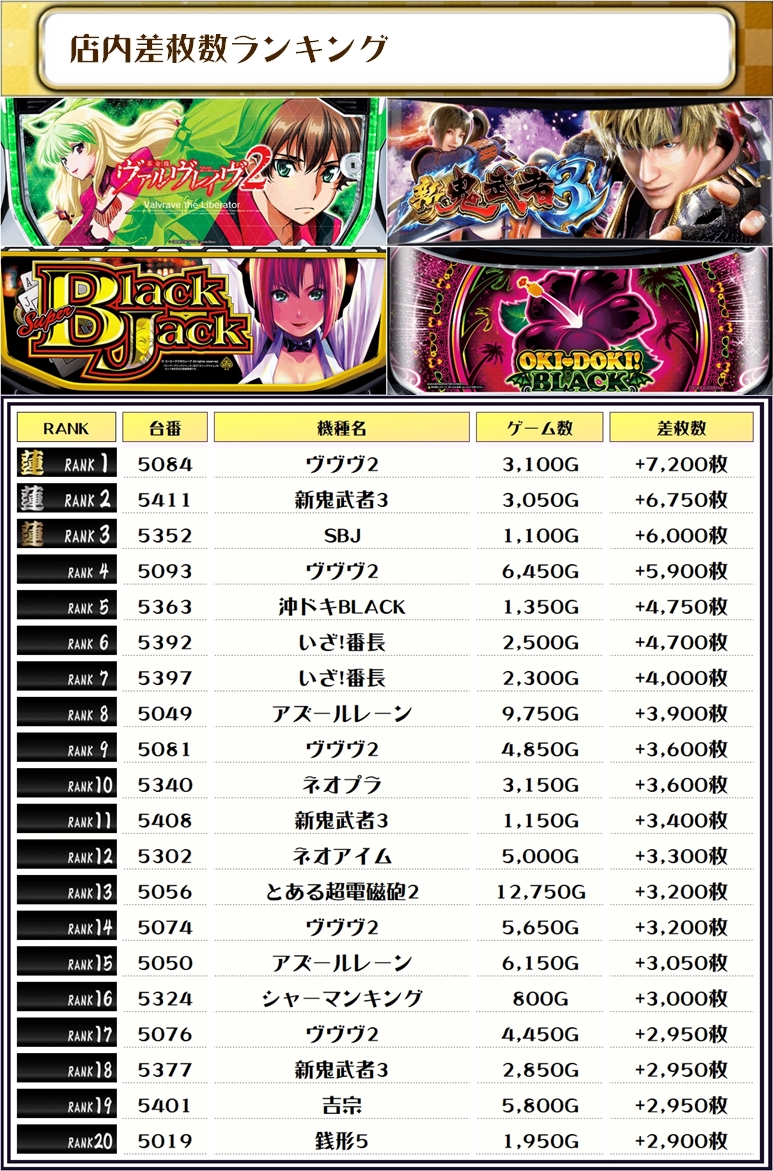 続く2位には【新鬼武者3・5411番台】の+6,750枚、そして3位には【SBJ・5352番台】の+6,000枚がランクインっ🏆🏆🏆