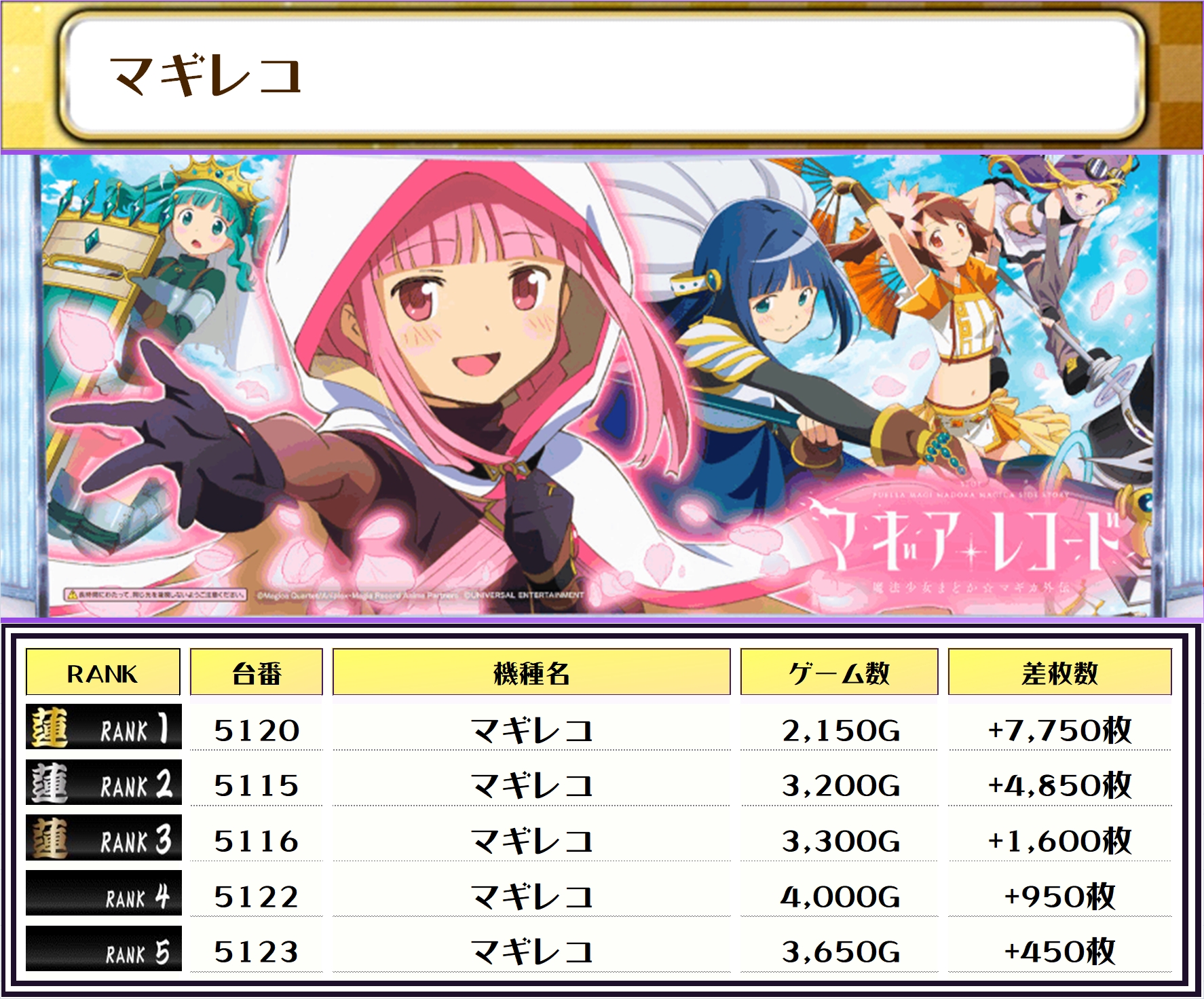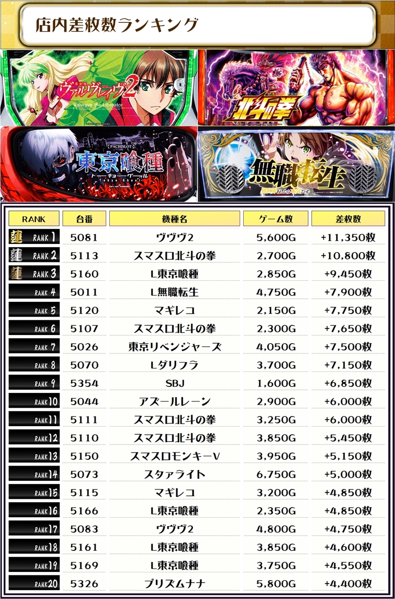 続く2位には【スマスロ北斗の拳・5113番台】の+10,800枚、そして3位には【L東京喰種・5160番台】の+9,450枚がランクインっ🏆🏆🏆