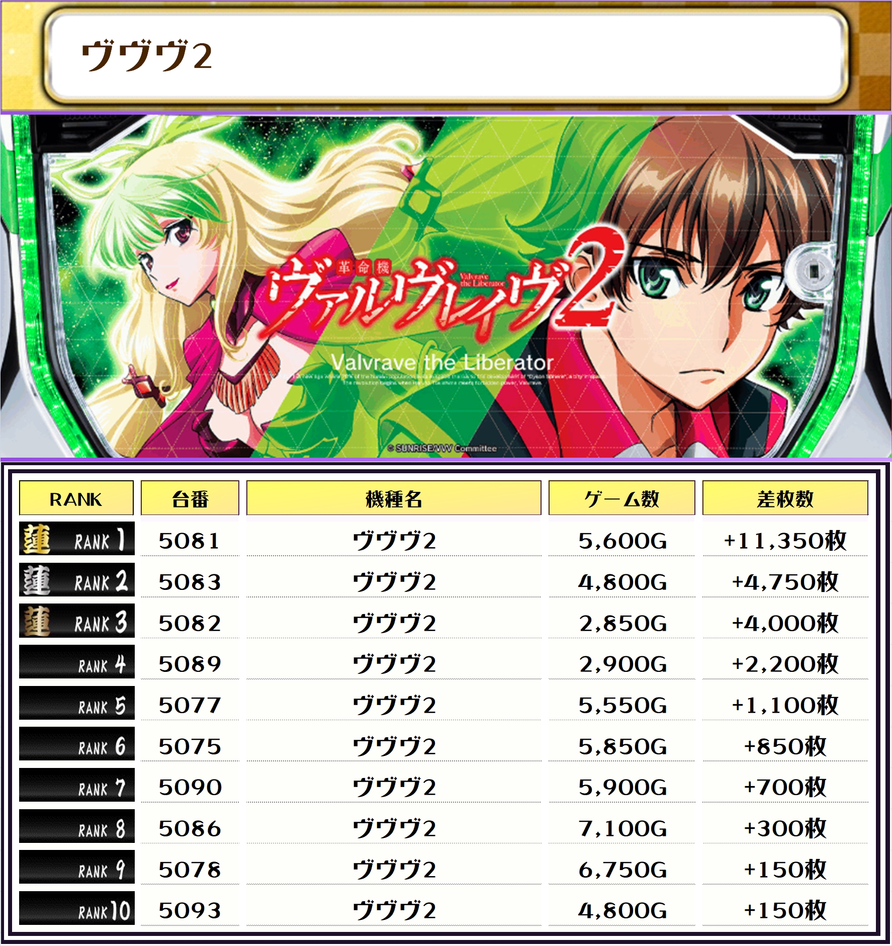 全体のTOPは【ヴヴヴ2・5081番台】で+11,350枚‼️