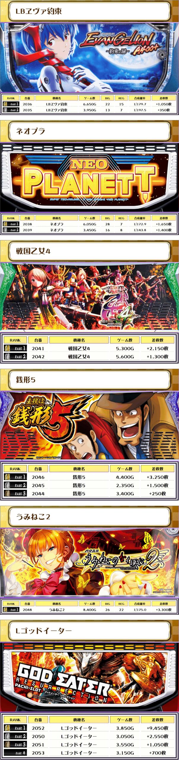 続く2位には【Lゴッドイーター・2052番台】の+9,450枚、そして3位には【新鬼武者3・2251番台】の+8,600枚がランクインっ🏆🏆🏆