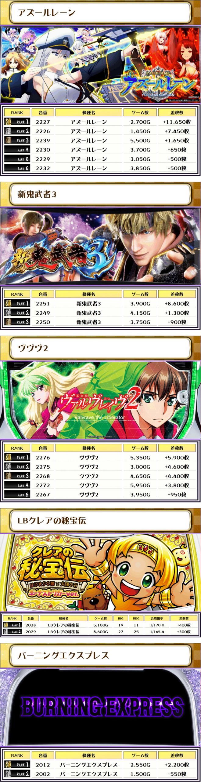全体のTOPは【アズールレーン・2227番台】で+11,650枚‼️