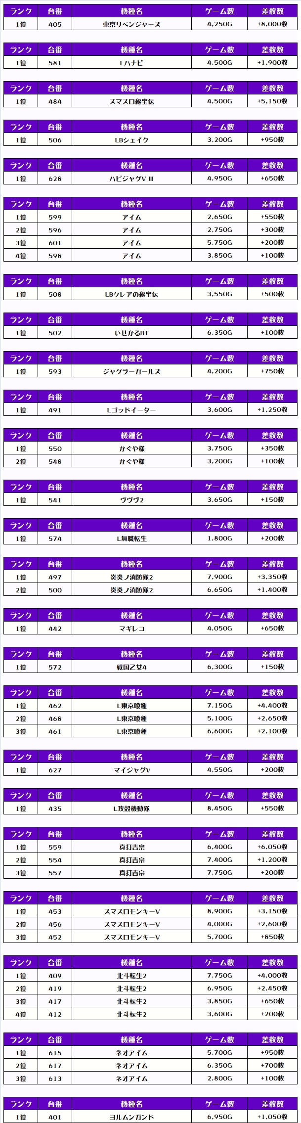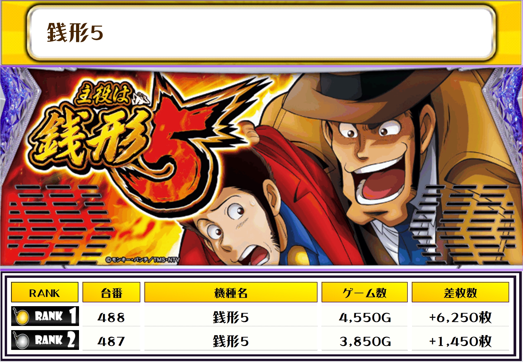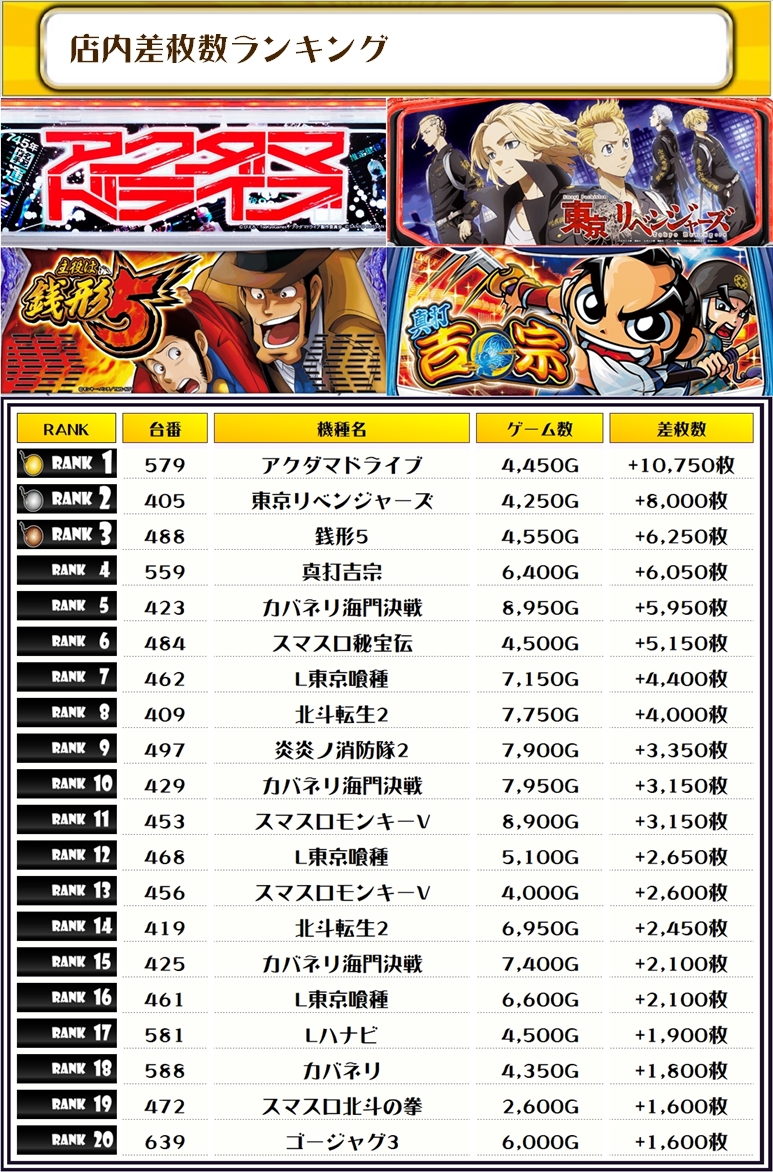 続く2位には【東京リベンジャーズ・405番台】の+8,000枚、そして3位には【銭形5・488番台】の+6,250枚がランクインっ🏆🏆🏆🏆