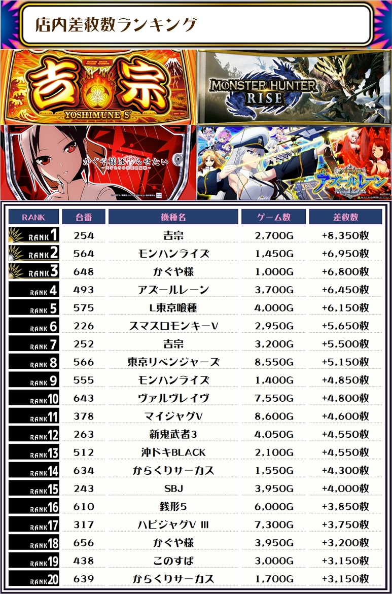 2位は【モンハンライズ・564番台】の+6,950枚、3位には【かぐや様・648番台】の+6,800枚がランクインっ🏆🏆🏆🏆