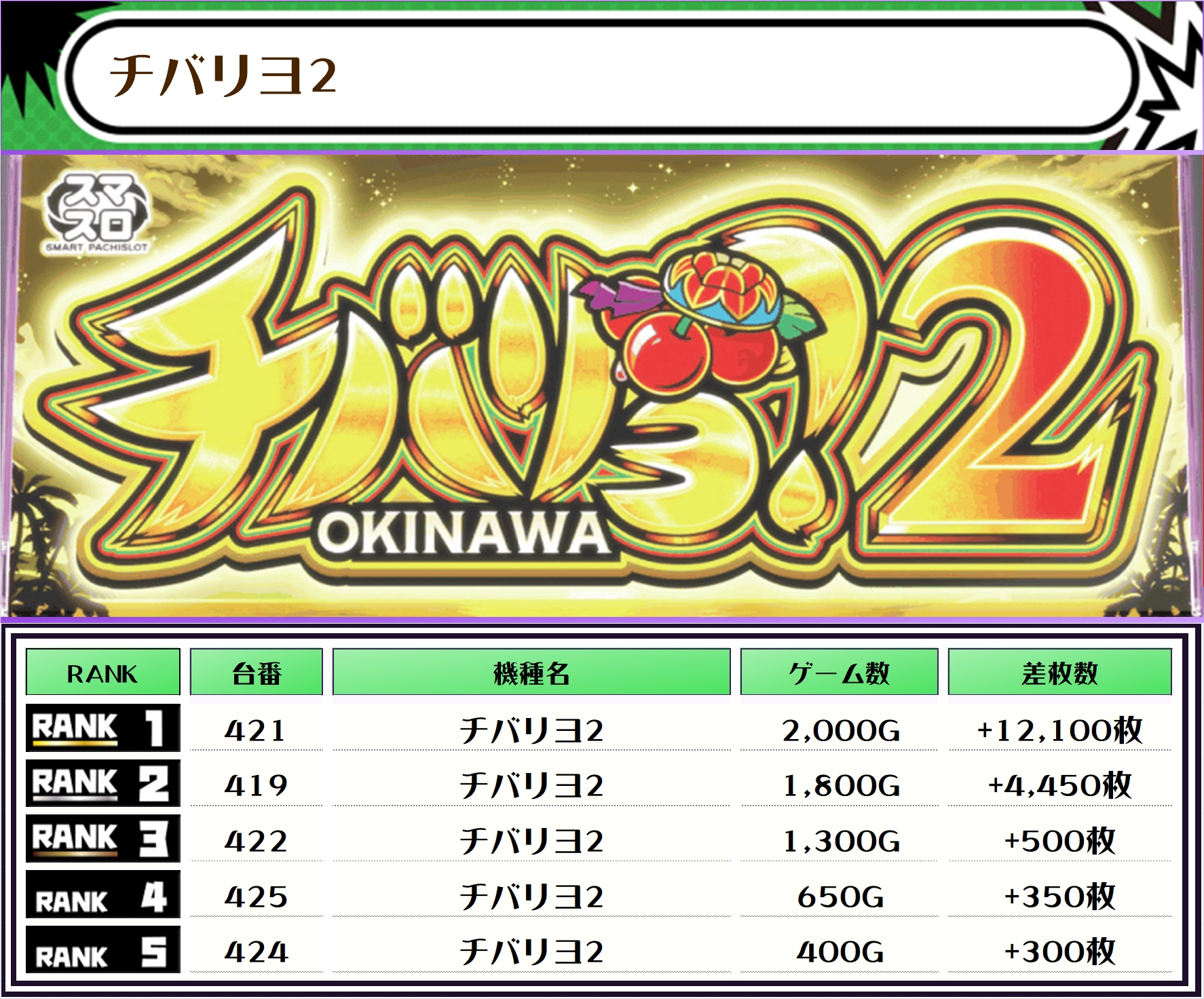 この日、全体の差枚トップに輝いたのは【チバリヨ2・421番台】の+12,100枚‼️