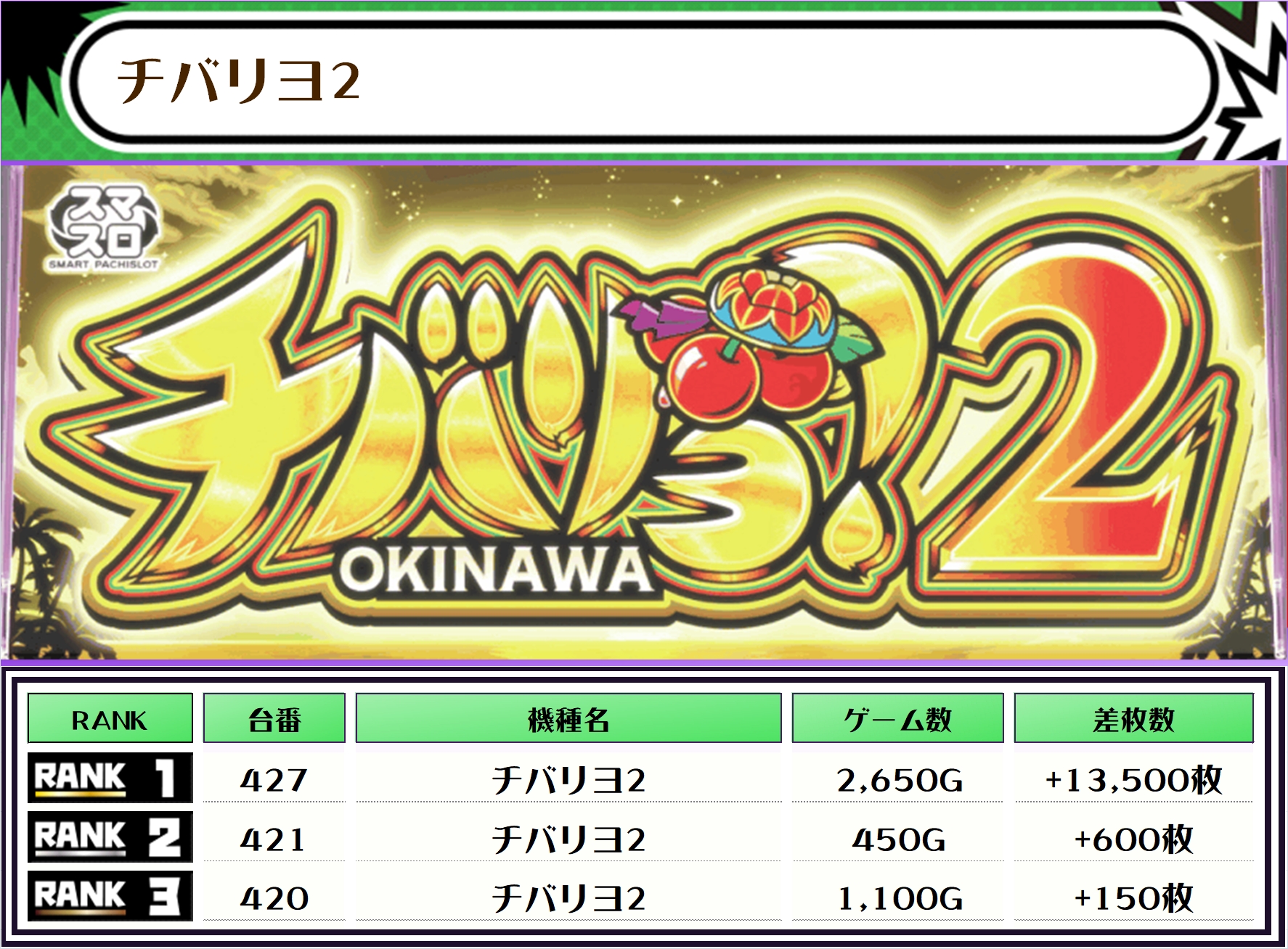 この日、全体の差枚トップに輝いたのは【チバリヨ2・427番台】の+13,500枚‼️