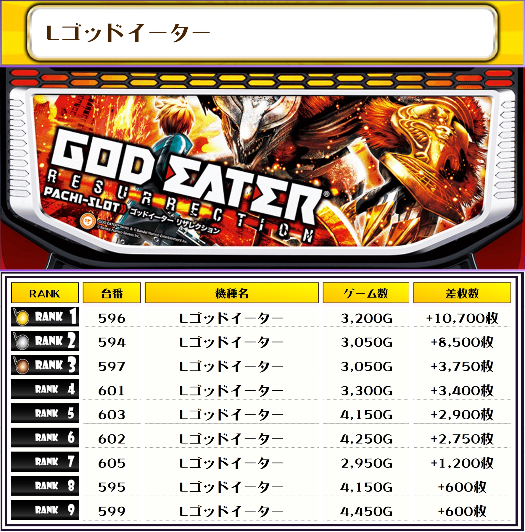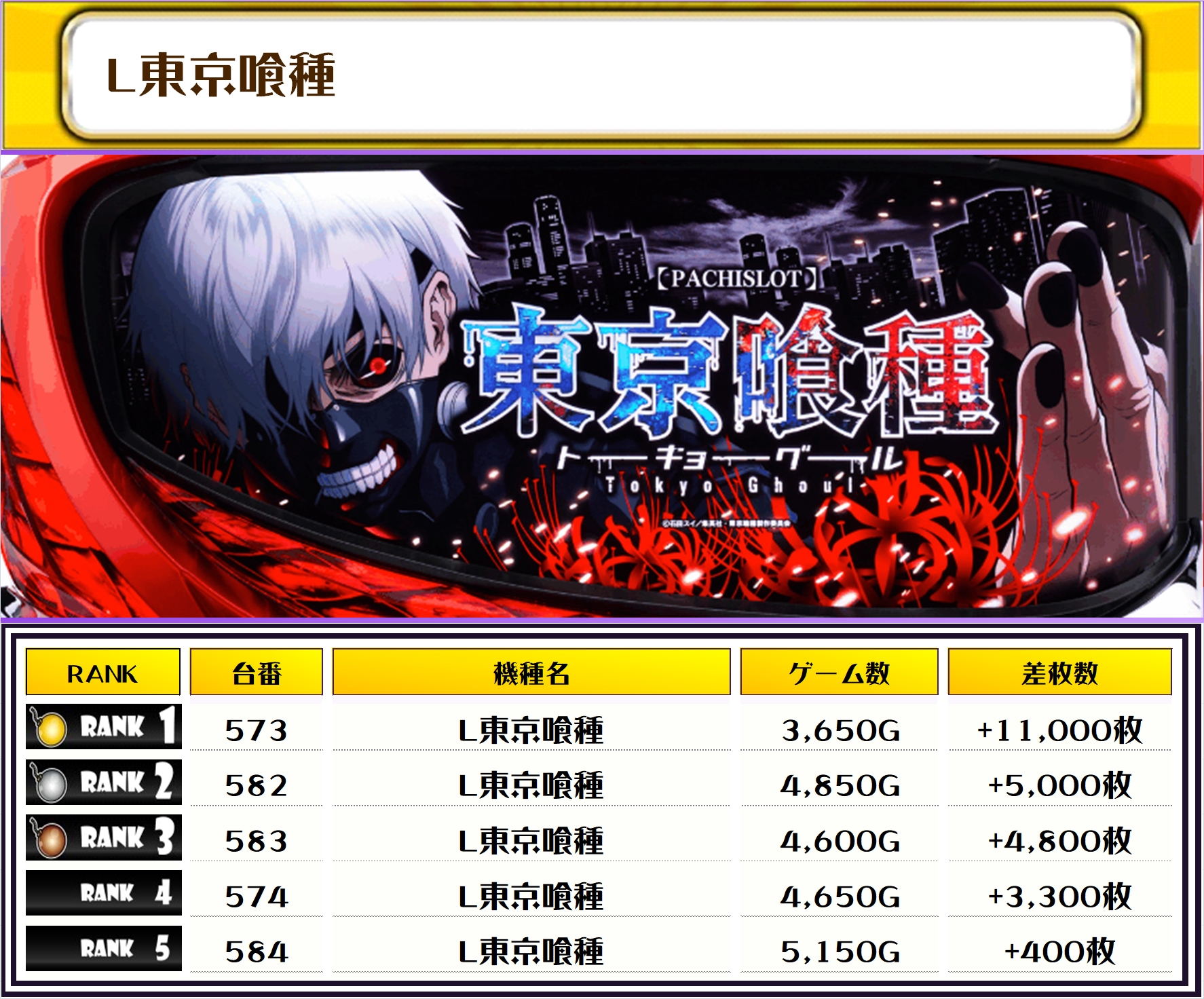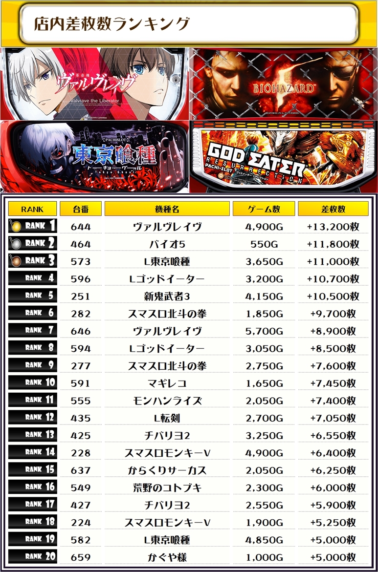 2位は【バイオ5・464番台】の+11,800枚、3位には【L東京喰種・573番台】の+11,100枚がランクインっ🏆🏆🏆🏆