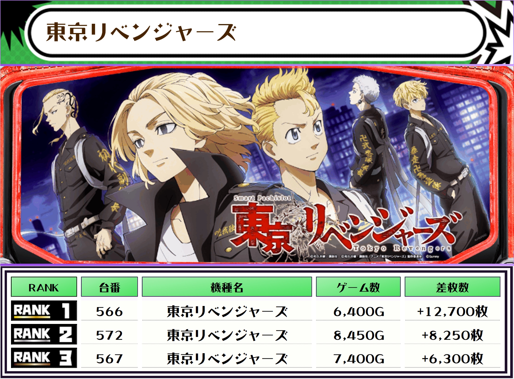 この日、全体の差枚トップに輝いたのは【東京リベンジャーズ・566番台】の+12,700枚‼️