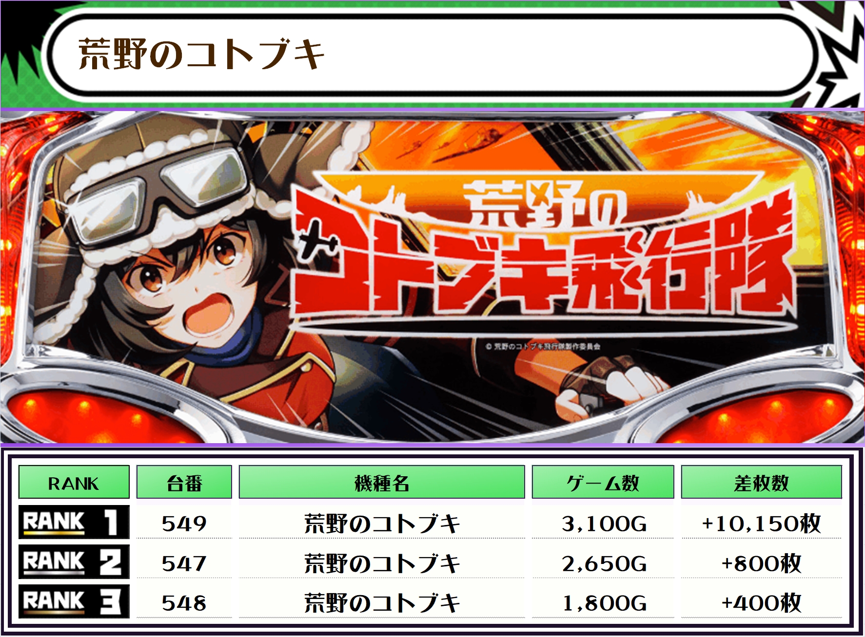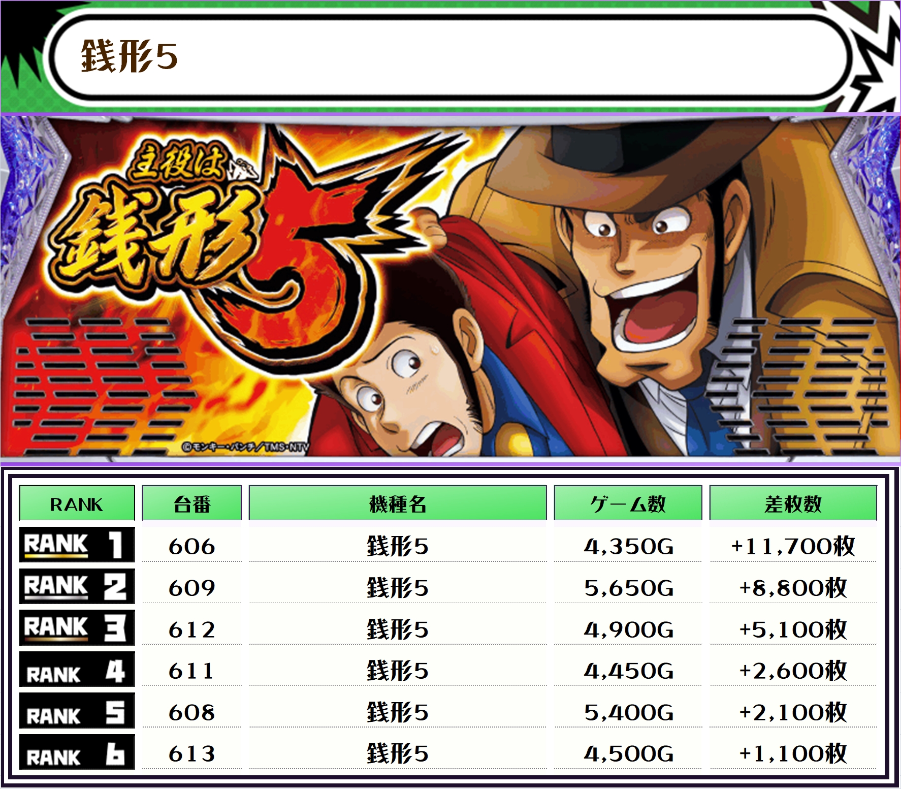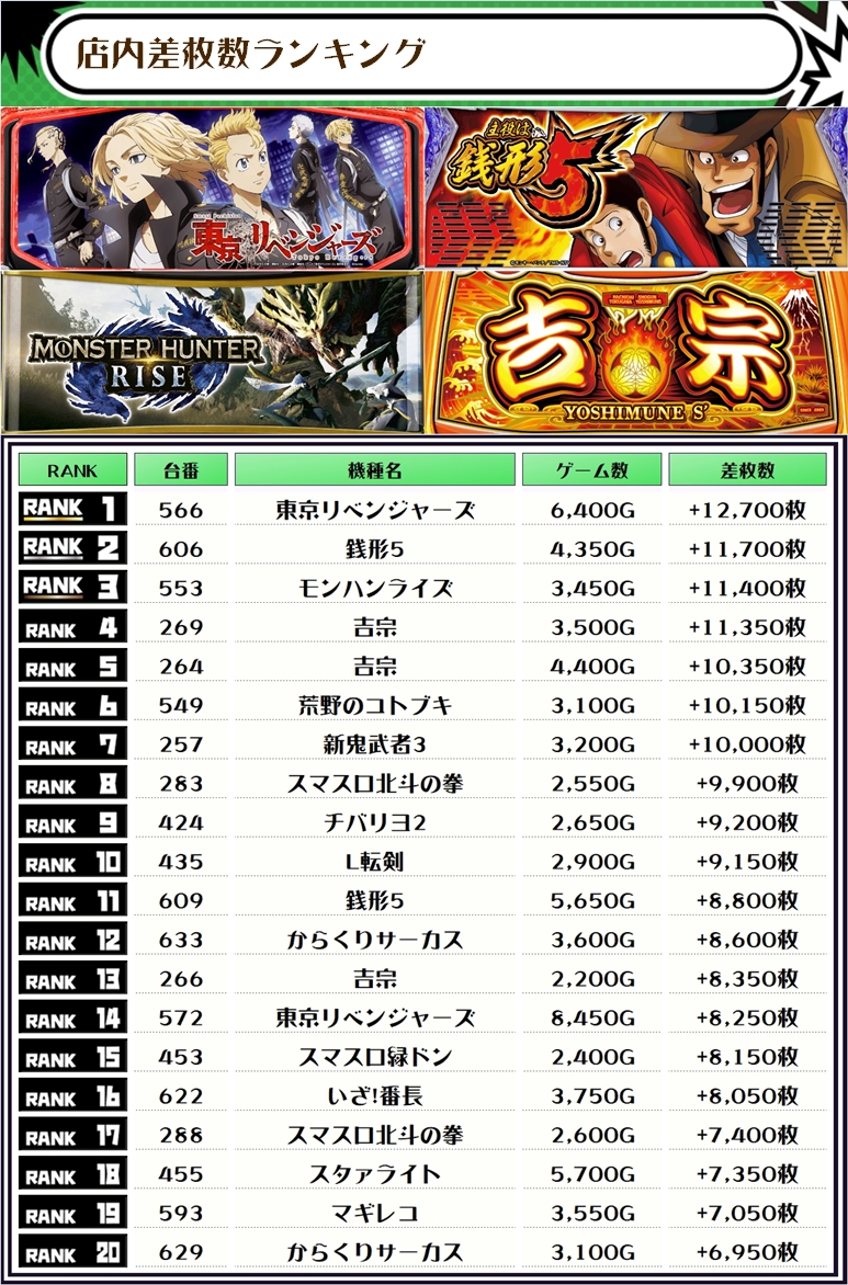 2位は【銭形5・606番台】の+11,700枚、3位には【モンハンライズ・553番台】の+11,400枚がランクインっ🏆🏆🏆🏆