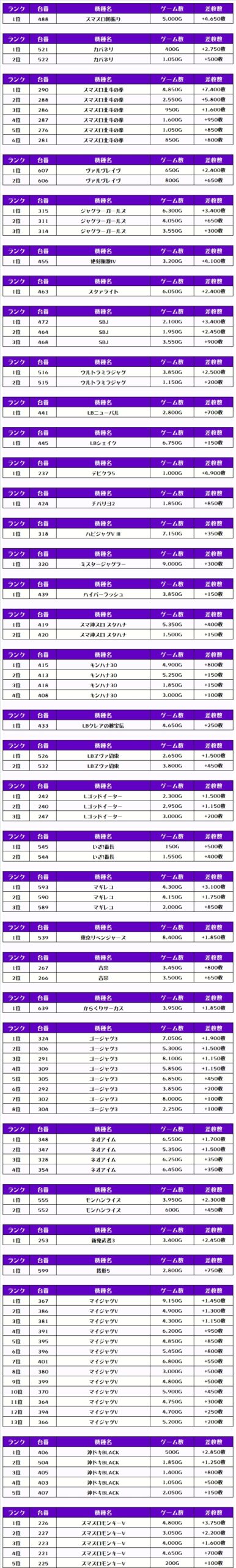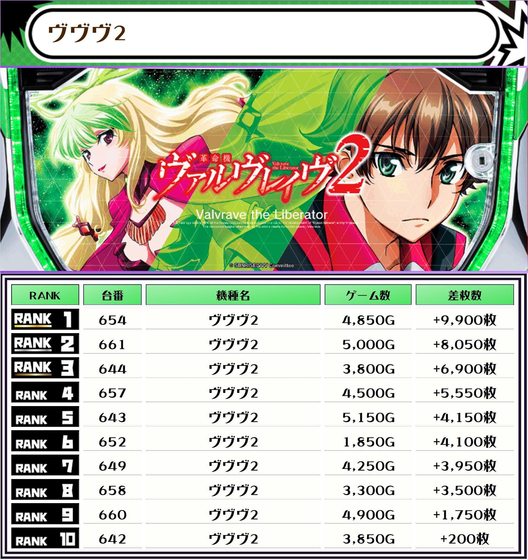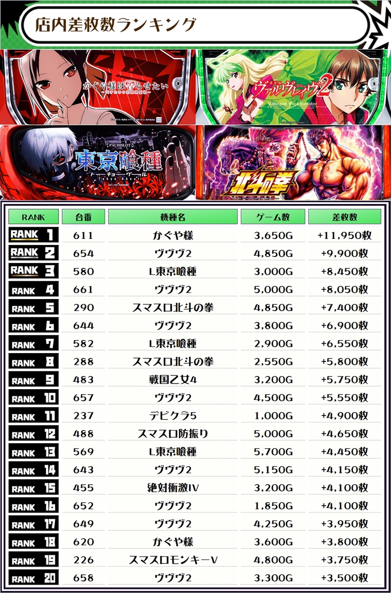 2位は【ヴヴヴ2・654番台】の+9,900枚、3位には【L東京喰種・580番台】の+8,450枚がランクインっ🏆🏆🏆🏆