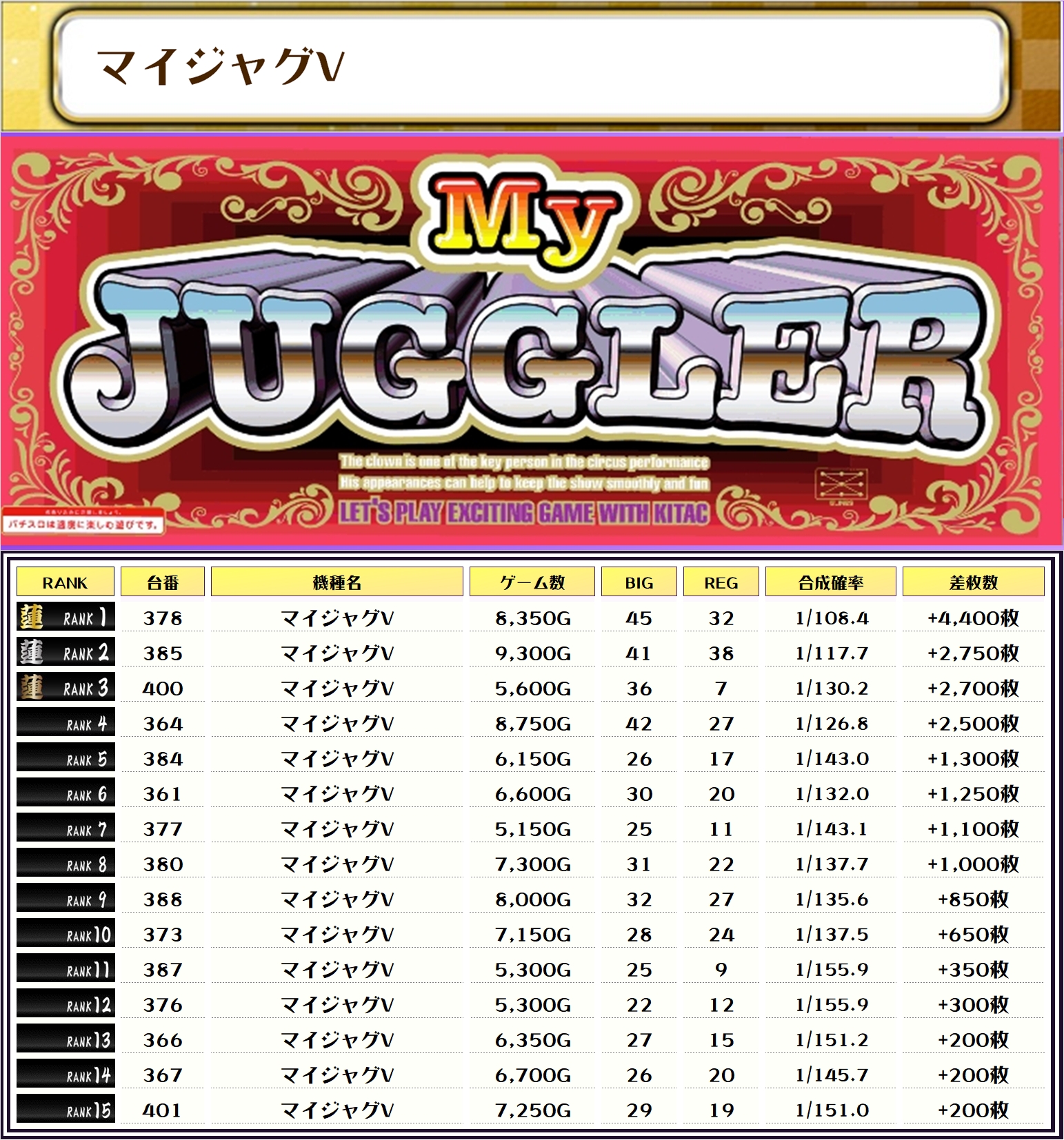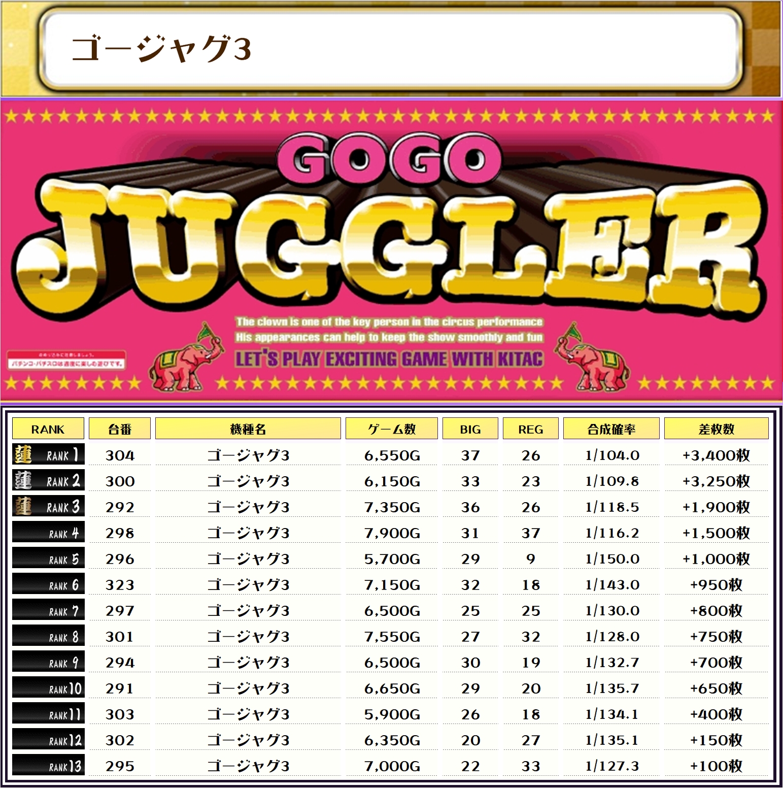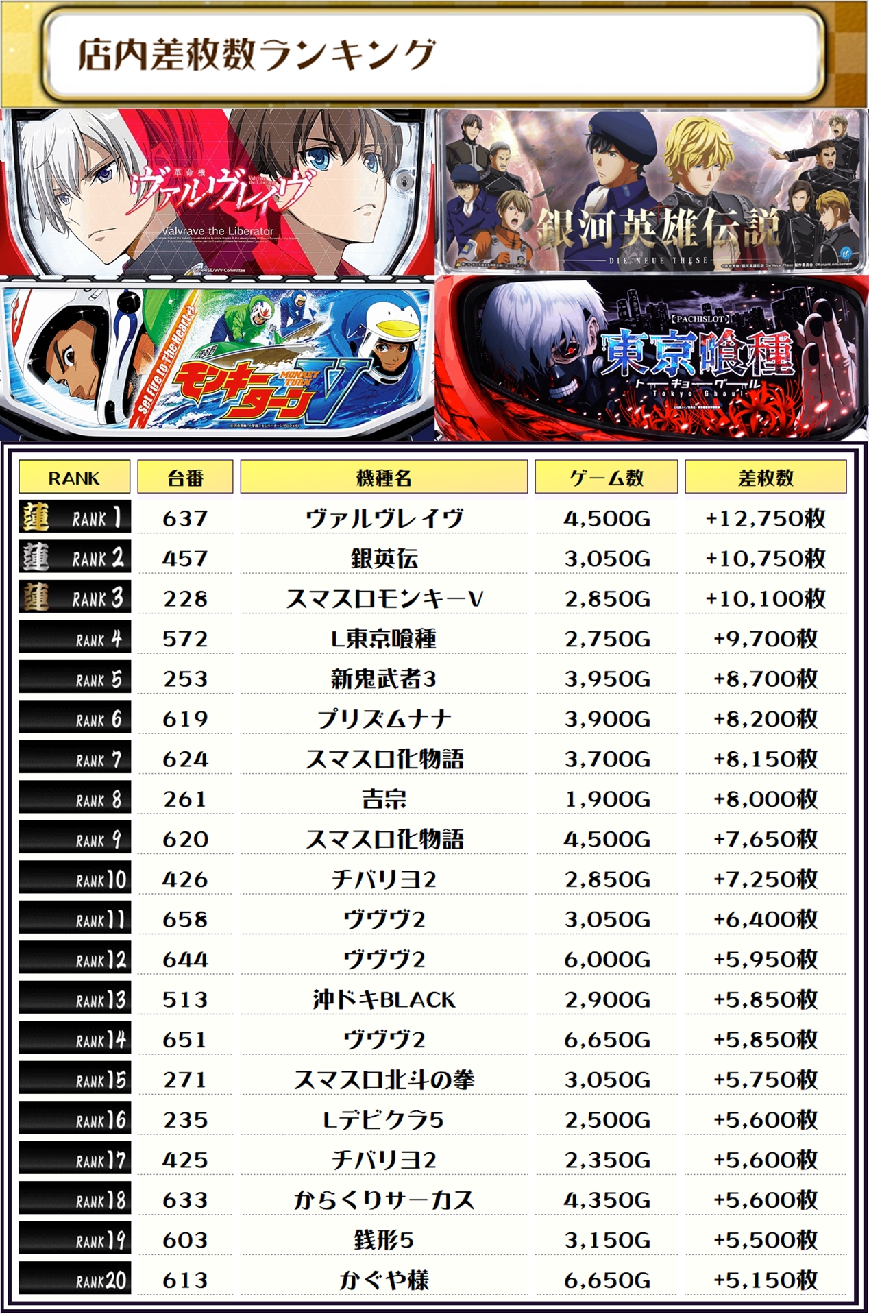 そして、この日全台を対象とした差枚ランキングがこちらになりますっ👍