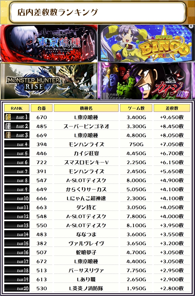 そして、この日全台を対象とした差枚ランキングがこちらになりますっ👍