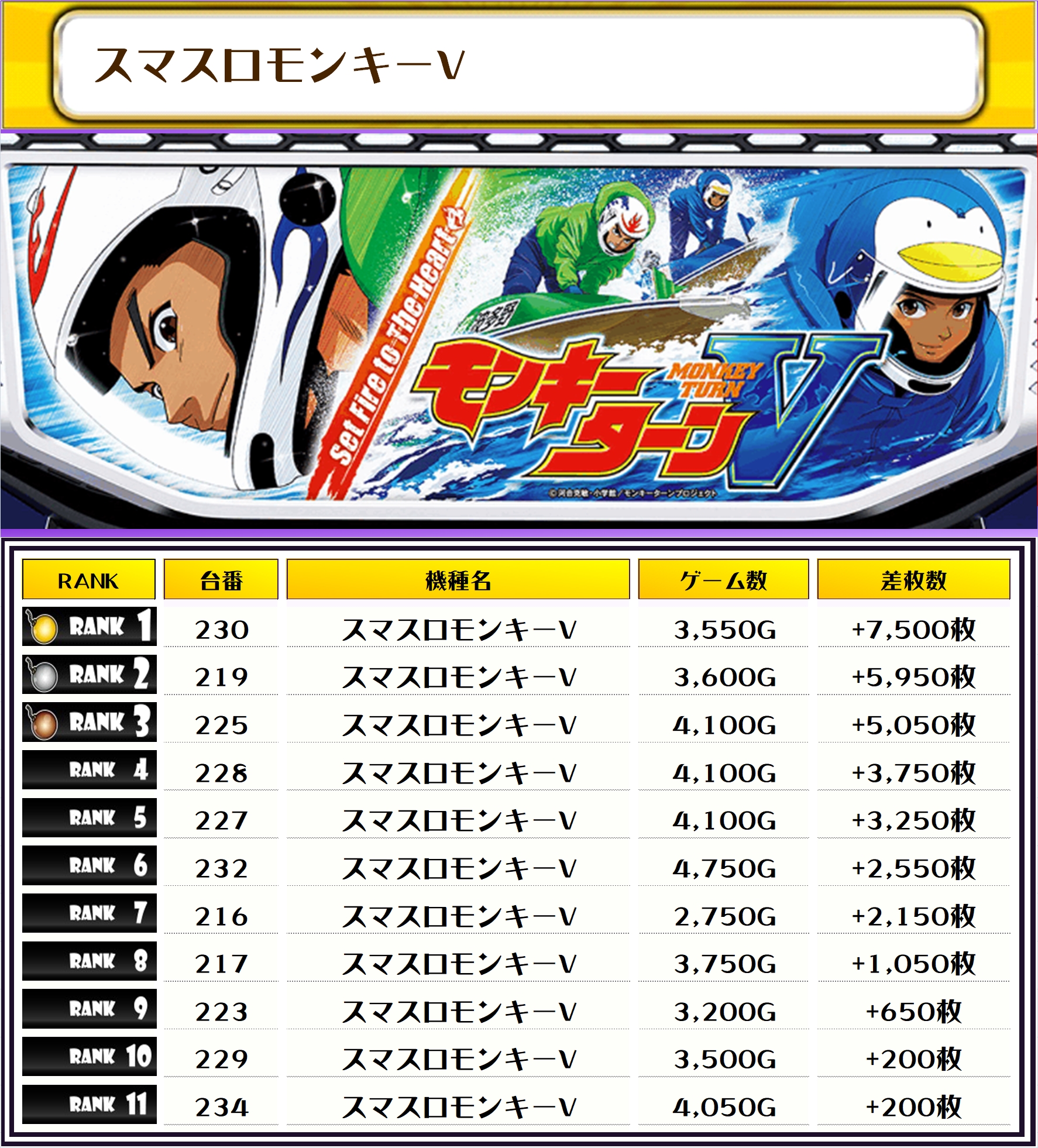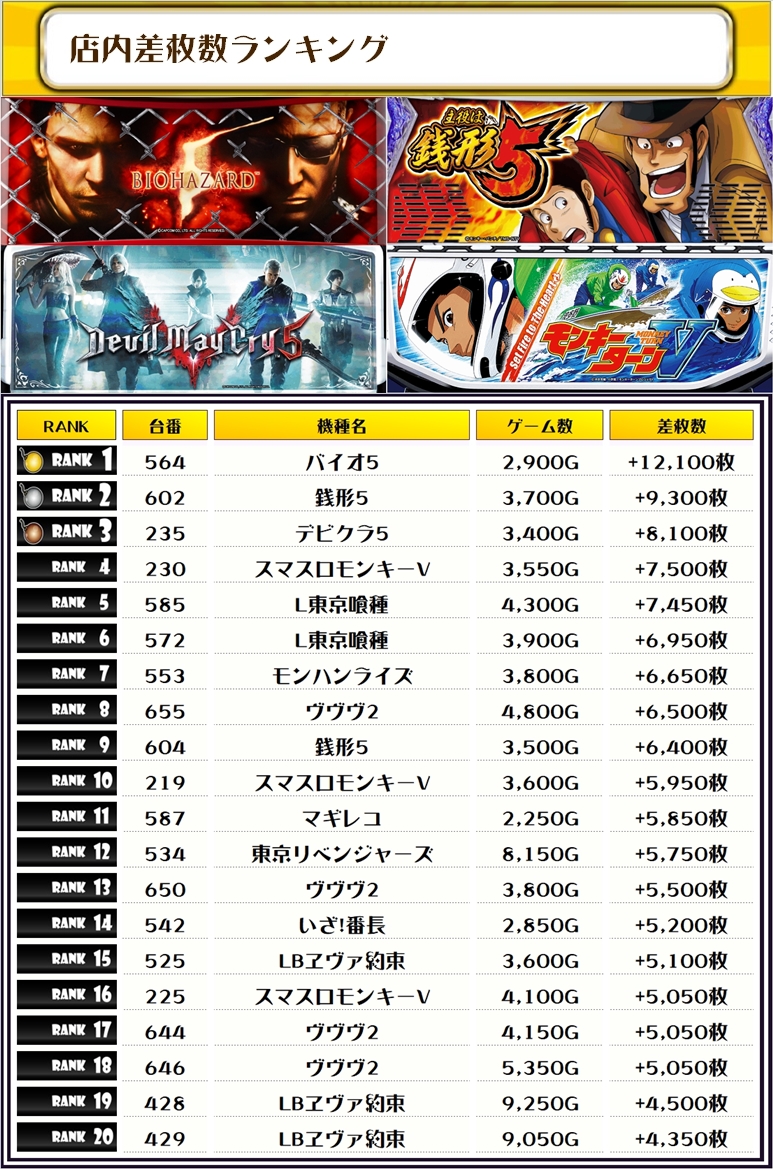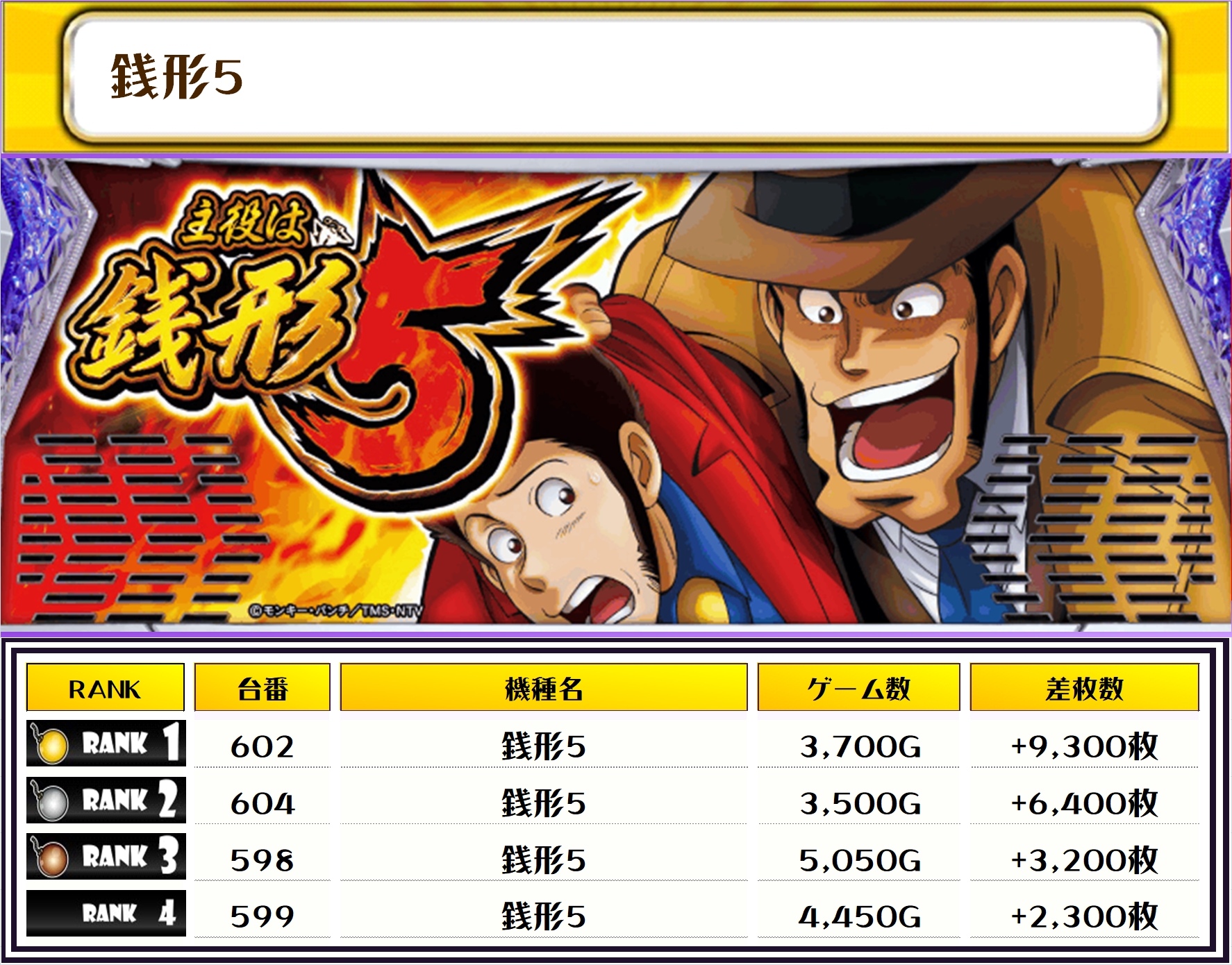 2位は【銭形5・602番台】の+9,300枚、3位には【デビクラ5・235番台】の+8,100枚がランクインっ🏆🏆🏆🏆