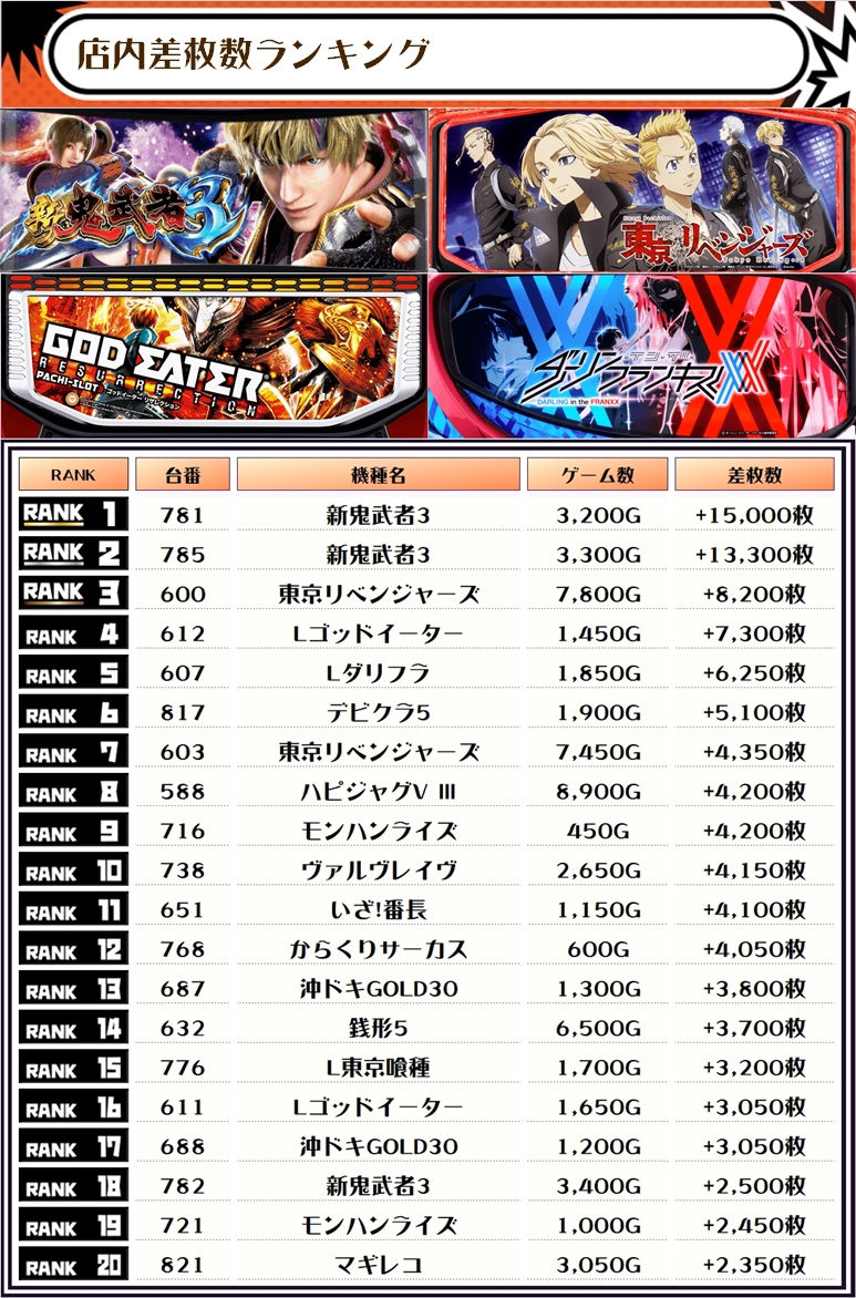 続く2位には同じく【新鬼武者3・785番台】の+13,300枚、3位には【東京リベンジャーズ・600番台】の+8,200枚がランクインっ🏆🏆🏆🏆