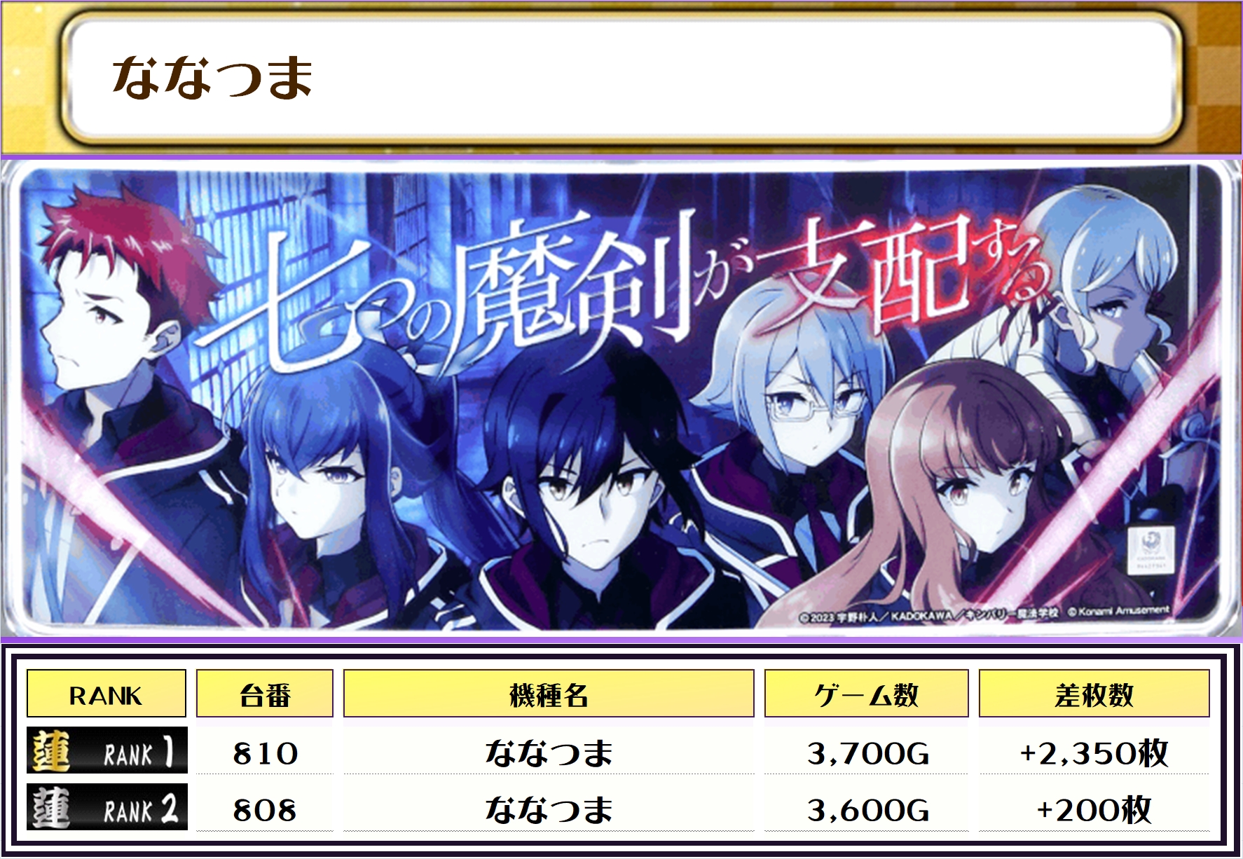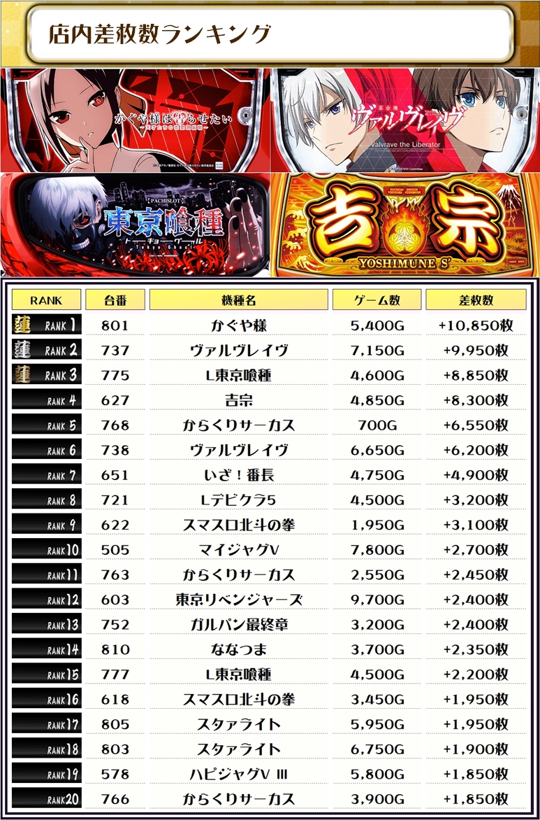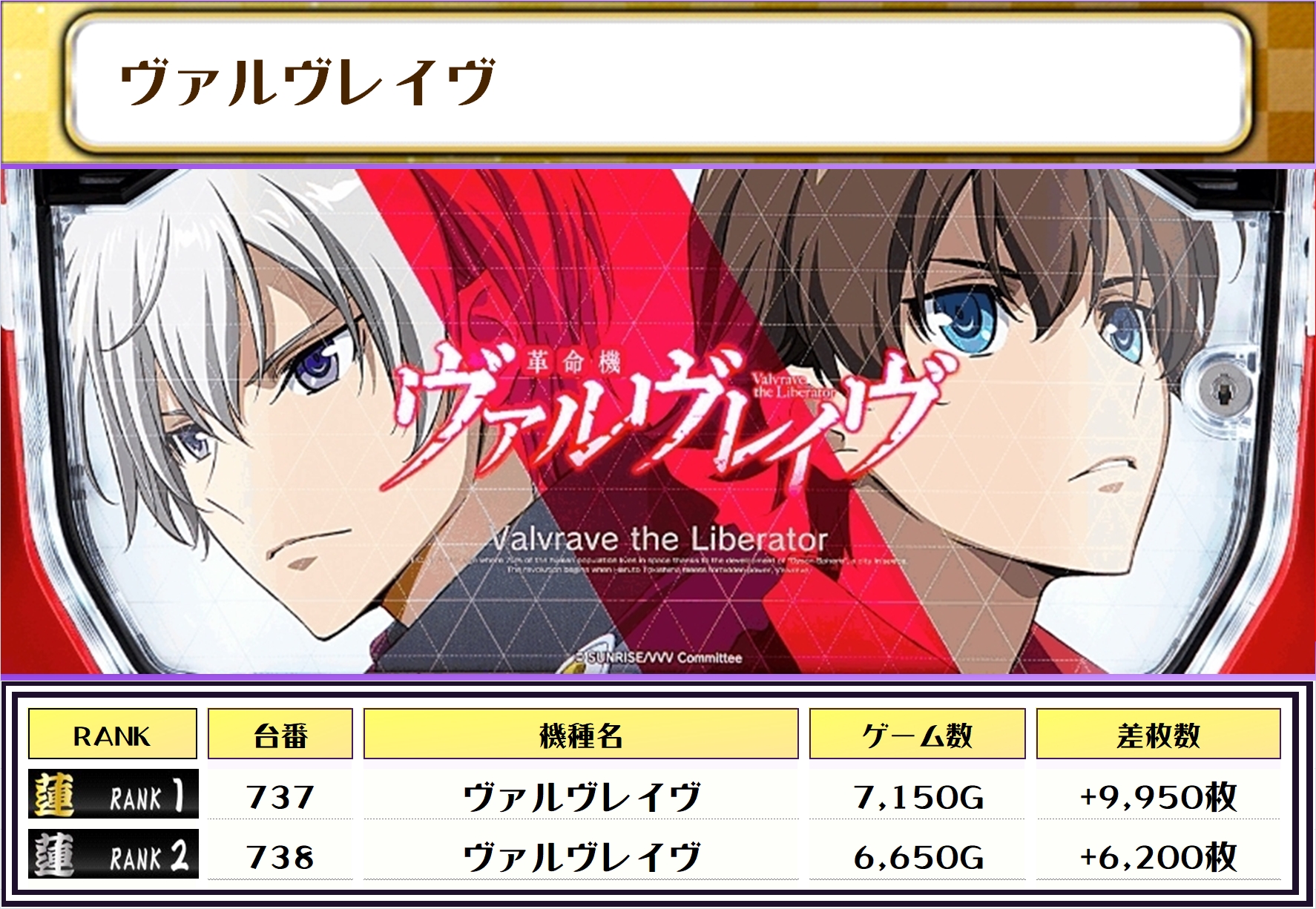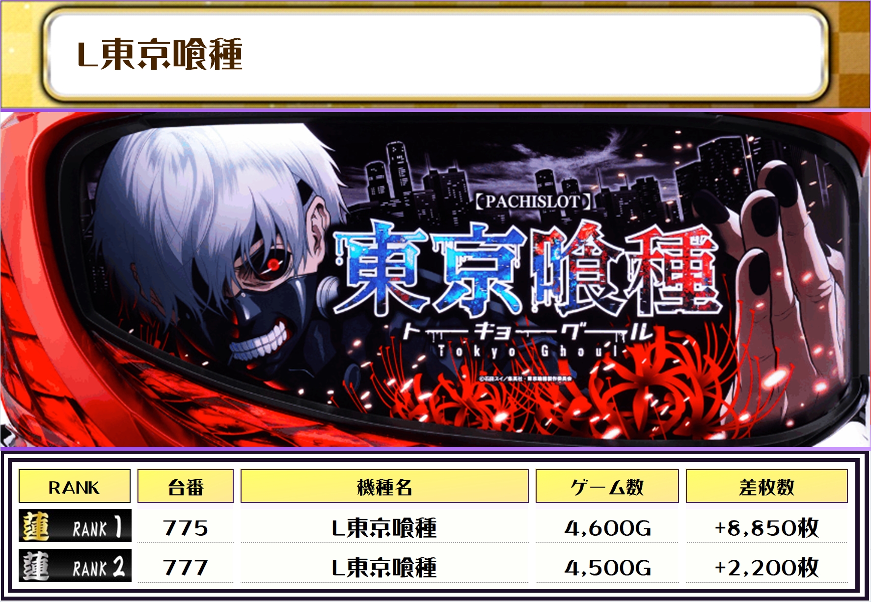 続く2位には【ヴァルヴレイヴ・737番台】の+9,950枚、そして3位は【L東京喰種・775番台】の+8,850枚がランクインっ🏆🏆🏆🏆