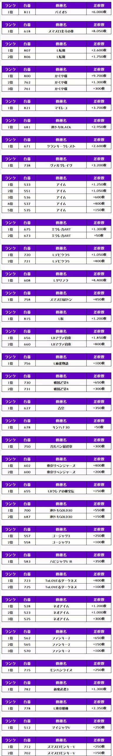 ピックアップはしていないが、L転剣やエウレカARTが2台設置ながら全台がプラス差枚!! デビクラ5が4台中2台プラス差枚など少数設置の台が好調な傾向があったようだ✅