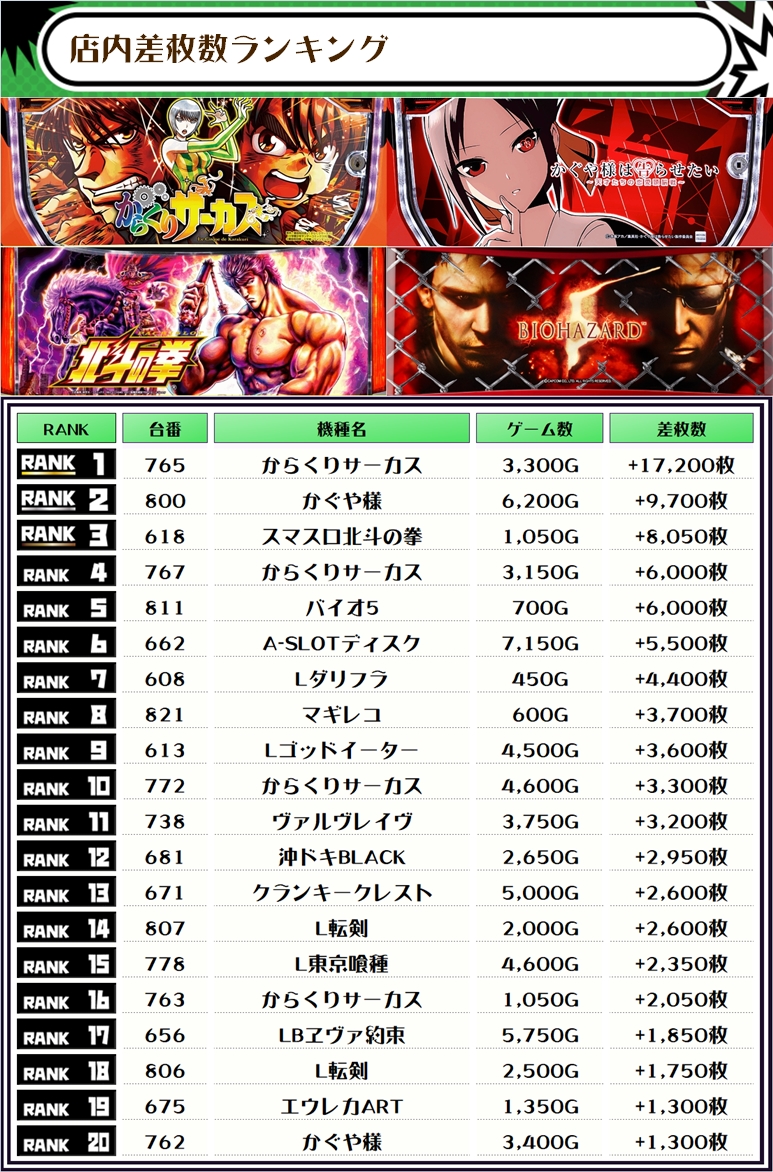 そして、この日全台を対象とした差枚ランキングがこちらになりますっ👍