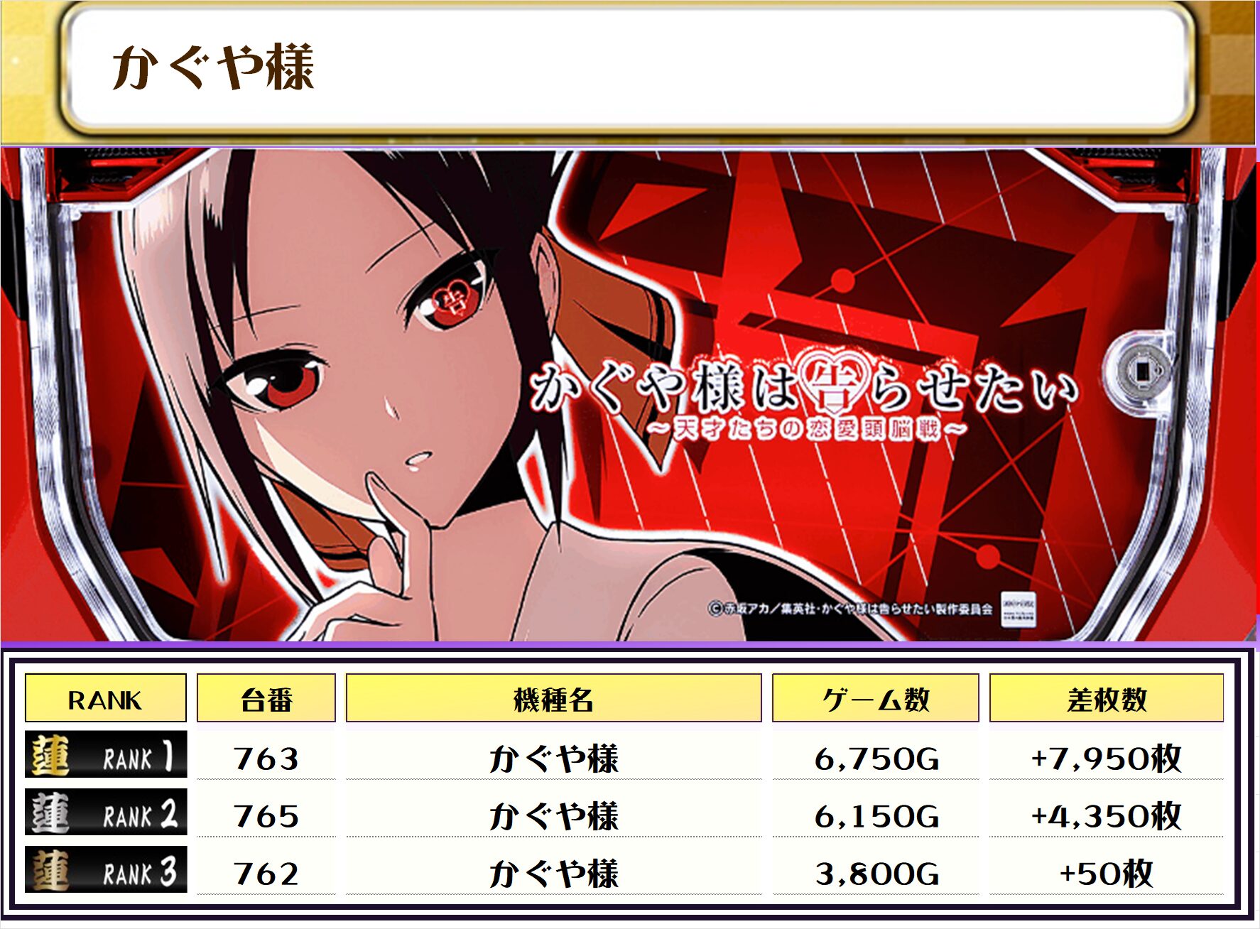 続く2位には【かぐや様・763番台】の+7,950枚、そして3位は【新鬼武者3・776番台】の+7,950枚がランクインっ🏆🏆🏆🏆