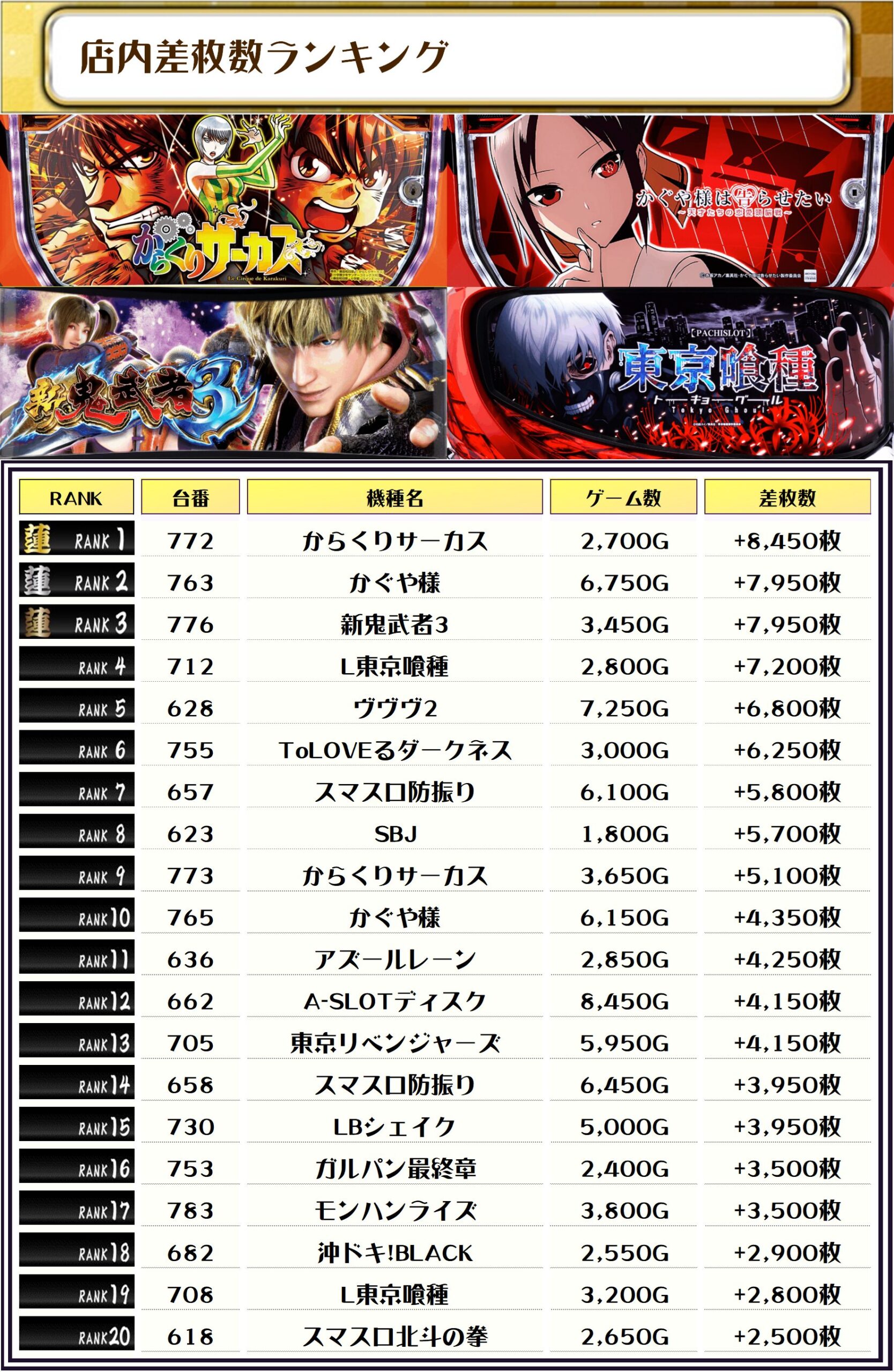 そして、この日全台を対象とした差枚ランキングがこちらになりますっ👍