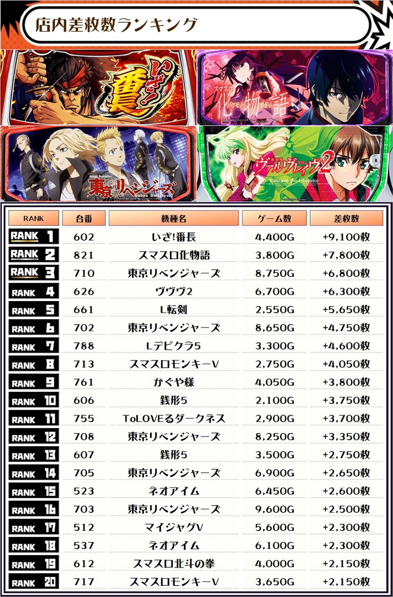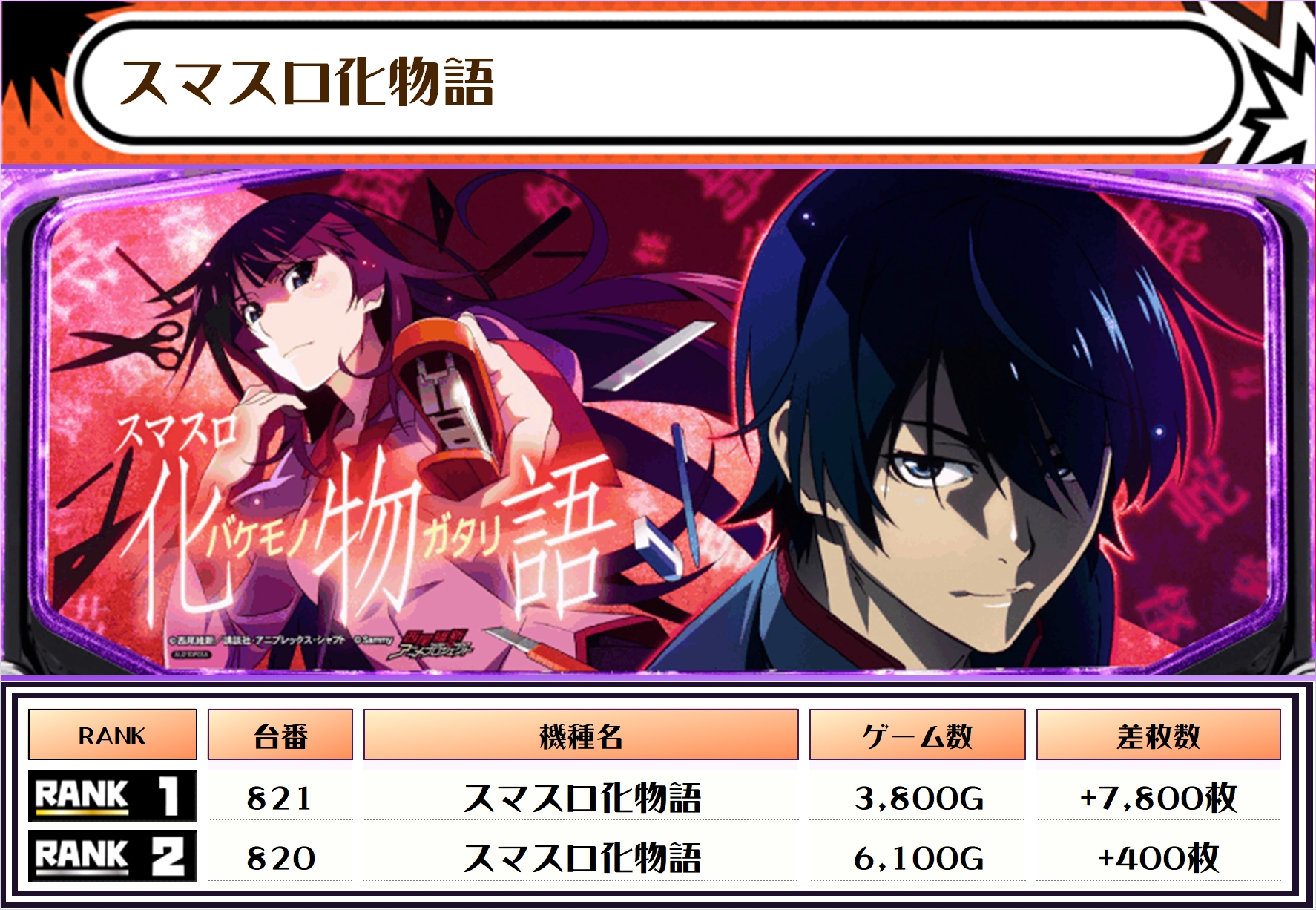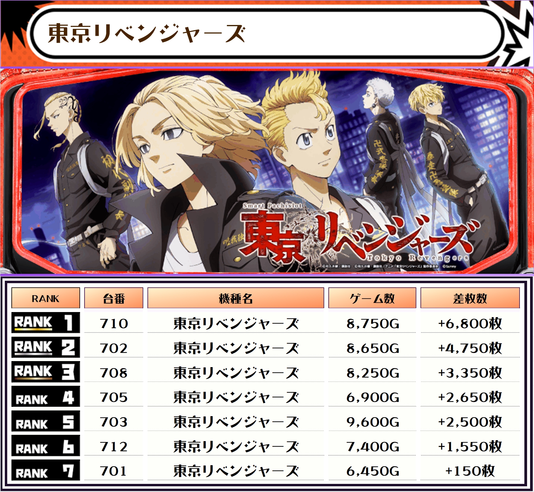 2位には【スマスロ化物語・821番台】の+7,800枚、3位には【東京リベンジャーズ・710番台】の+6,800枚がランクインっ🏆🏆🏆🏆