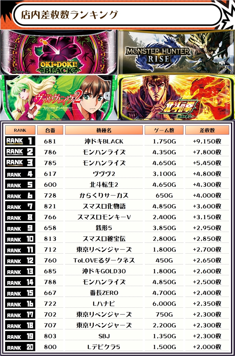 続く2位には【モンハンライズ・786番台】の+7,800枚、3位には同じくモンハンライズ・785番台】の+5,450枚がランクインっ🏆🏆🏆🏆