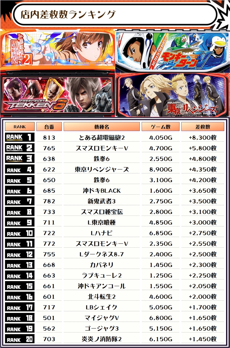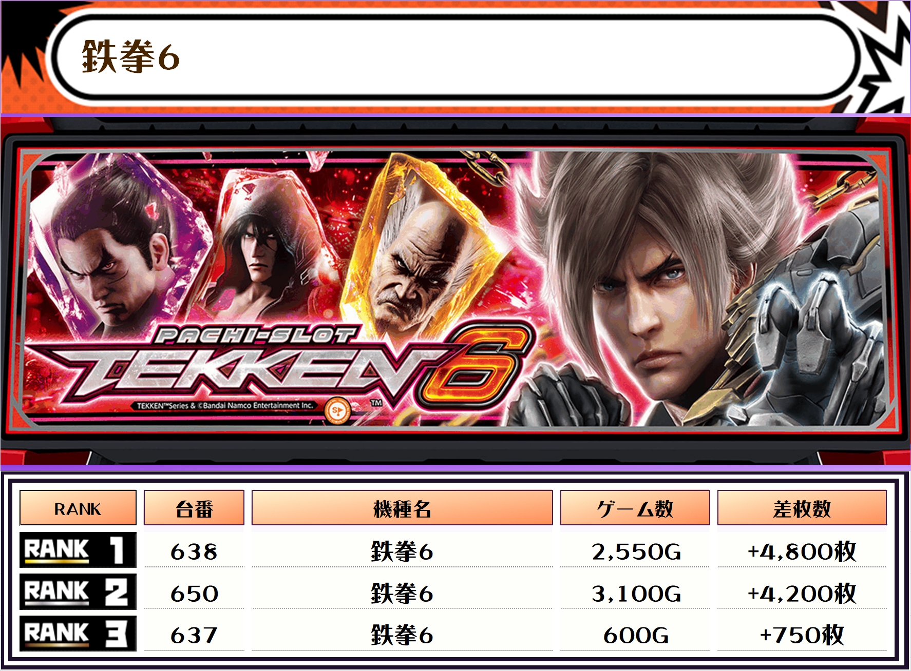 続く2位には【スマスロモンキーV・765番台】の+5,800枚、そして3位には【鉄拳6・638番台】の+4,800枚がランクインっ🏆🏆🏆🏆